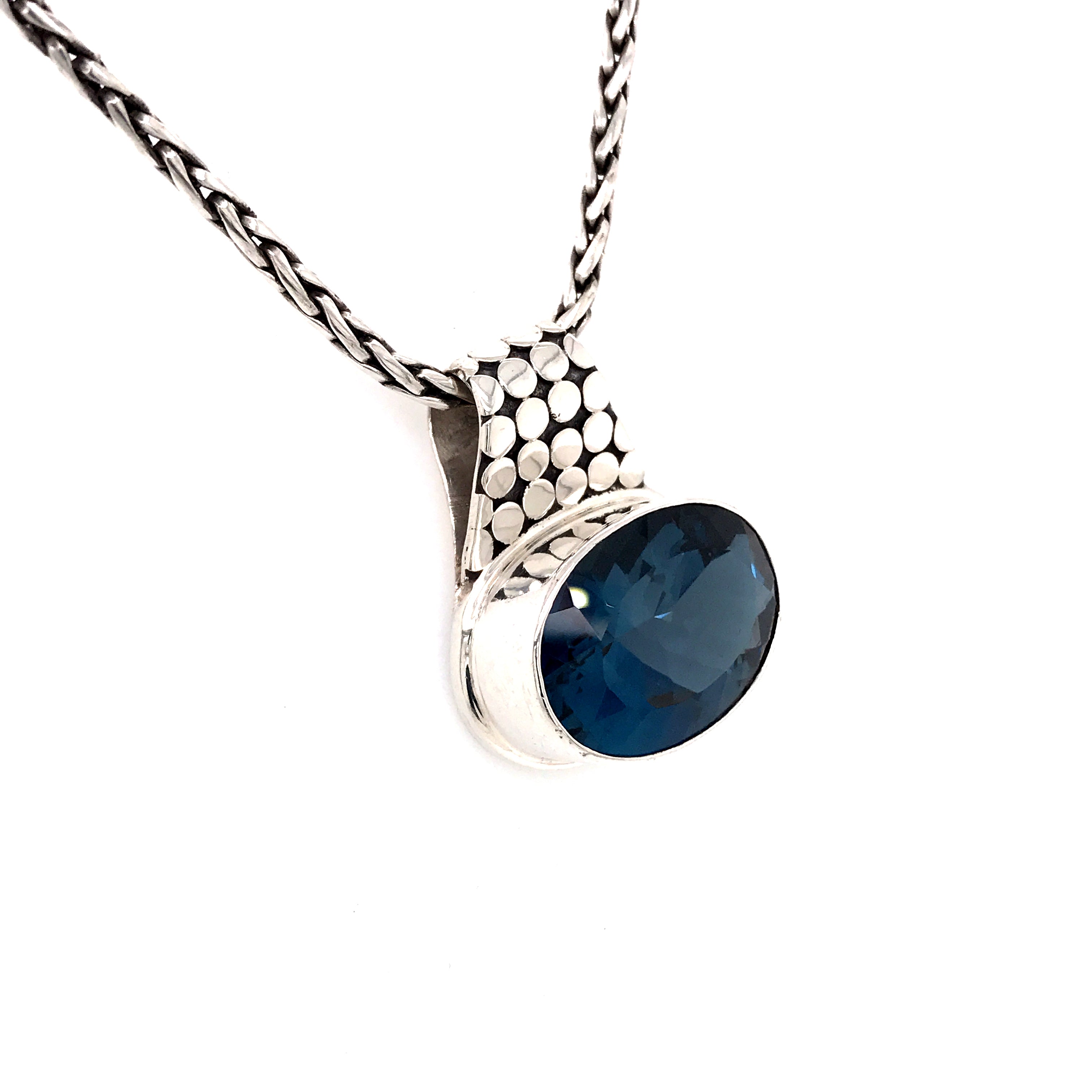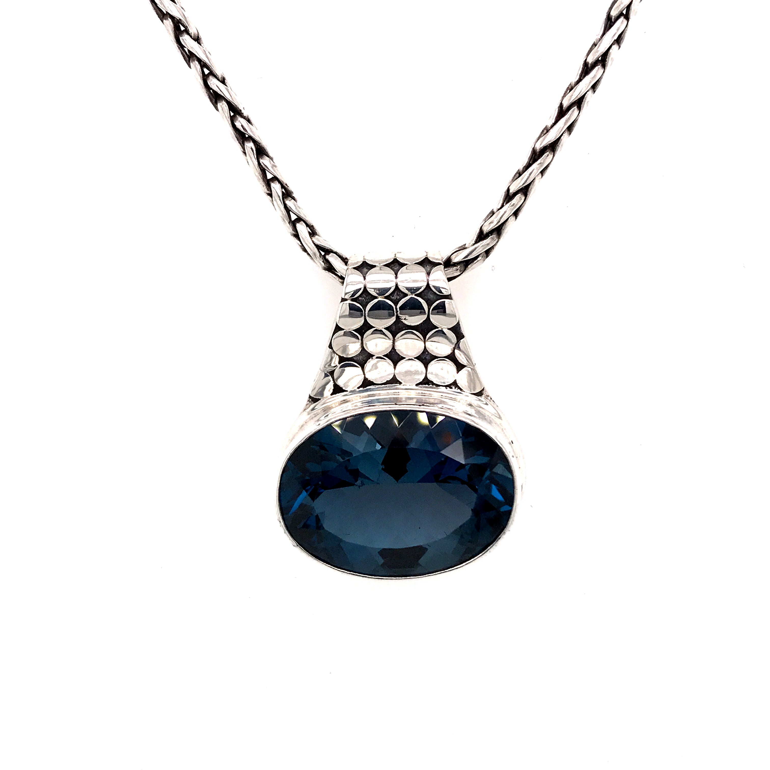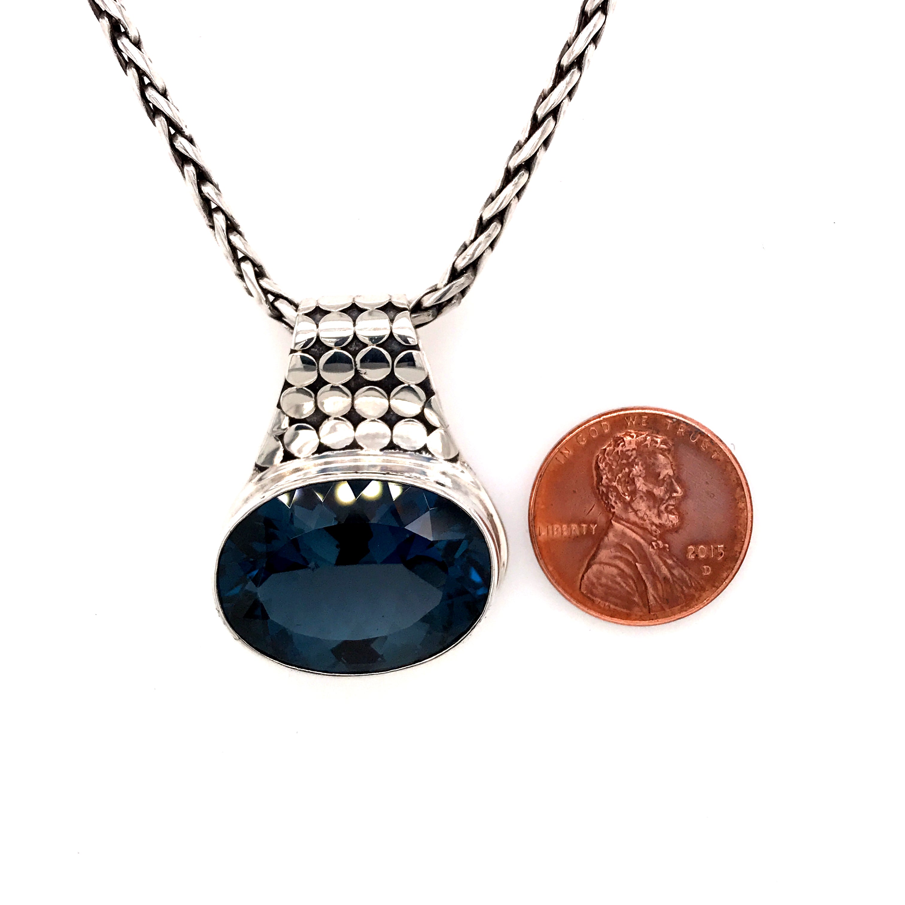 Extra Large Sterling Silver Armadillo Pendant with One Medium Oval London Blue Topaz on a Handwoven Sterling Silver Chain, 34 Inches in Length.Local Lake Tahoe Designer.