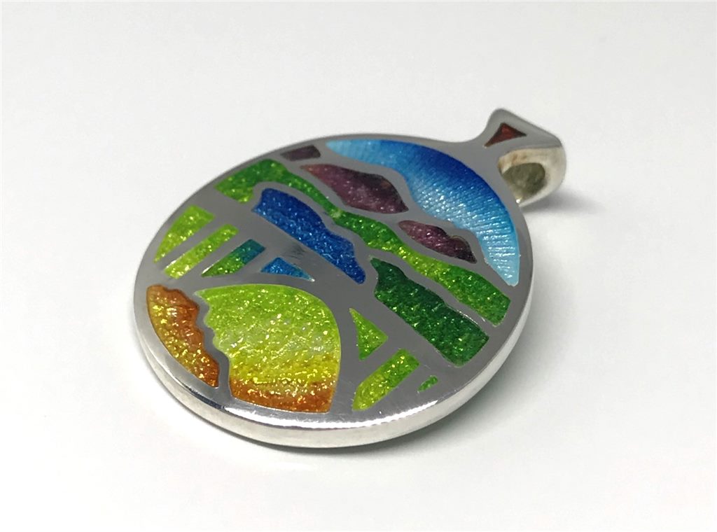 Fine Silver Enamel Truckee Pendant of Donner Lake & Rainbow Bridge in Truckee.DESIGNED BY Benton BigelowBLUESTONE JEWELRY EXCLUSIVE DESIGNIt has 3 to 5 layers of enamel set in fine silver with textured background to give this beautiful piece its depth.