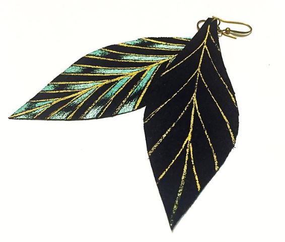 Gabriella Leather Feather Earrings with Gold & Teal design on Black Le