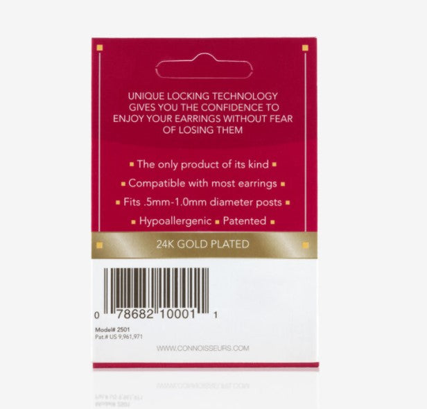 Gold-Toned Locking Earring Backs. Pack of 2 Pairs.Made of 24K gold-plated surgical stainless steel, our Locking Earring Backs fit 99% of all earring posts (0.5 – 1.0mm). They’re easy to use: just slide on posts and they lock automatically; one squeeze and they pull right off..Wear them with all your gold pierced earrings and multiple piercings to keep your jewelry investment safe and secure.