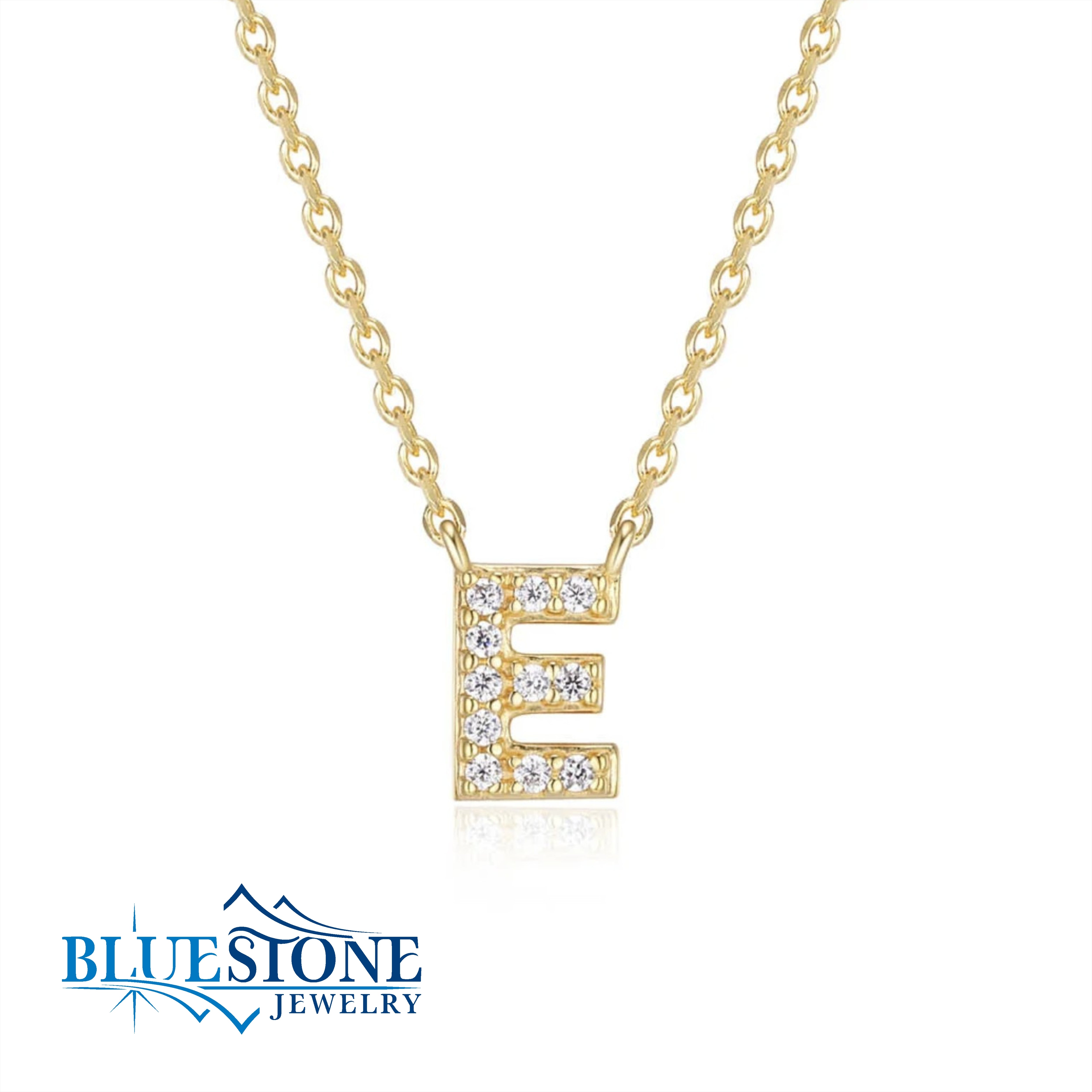 18 Karat Yellow Gold Plated Sterling Silver "E" Initial Necklace Featuring Cubic Zirconia Accents. Pendant Measures Approximately 5mm x 7mm. Pendant Comes Fixed onto an 18" Chain.