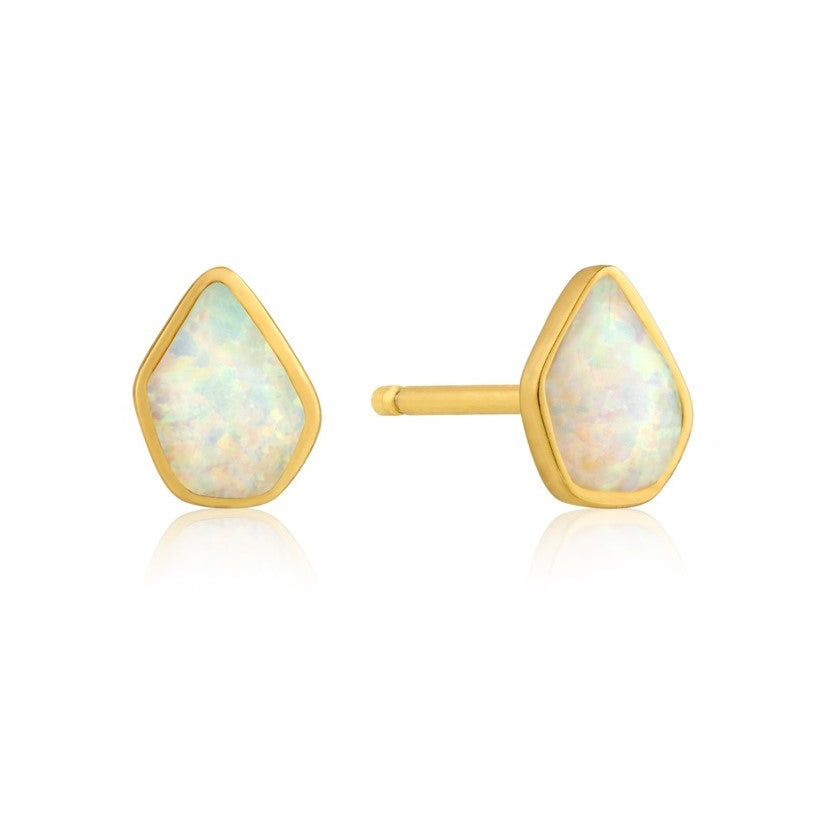 Sterling Silver with 14 Karat Yellow Gold Plating Stud Earrings with Lab Grown Opals. Measure Approximately 5mm x 7mm Wide.