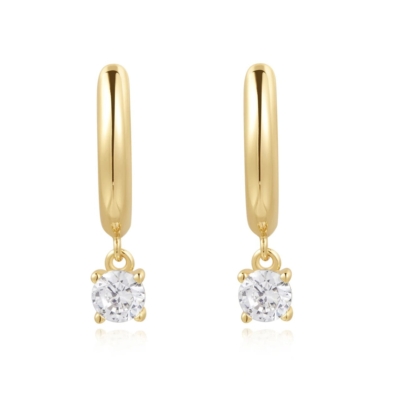 Sterling Silver Rhodium and 14KT Yellow Gold Plated Solitaire Huggie Hoop Earrings with 2 Cubic Zirconia Gemstones. Measure 1/4 Inch.