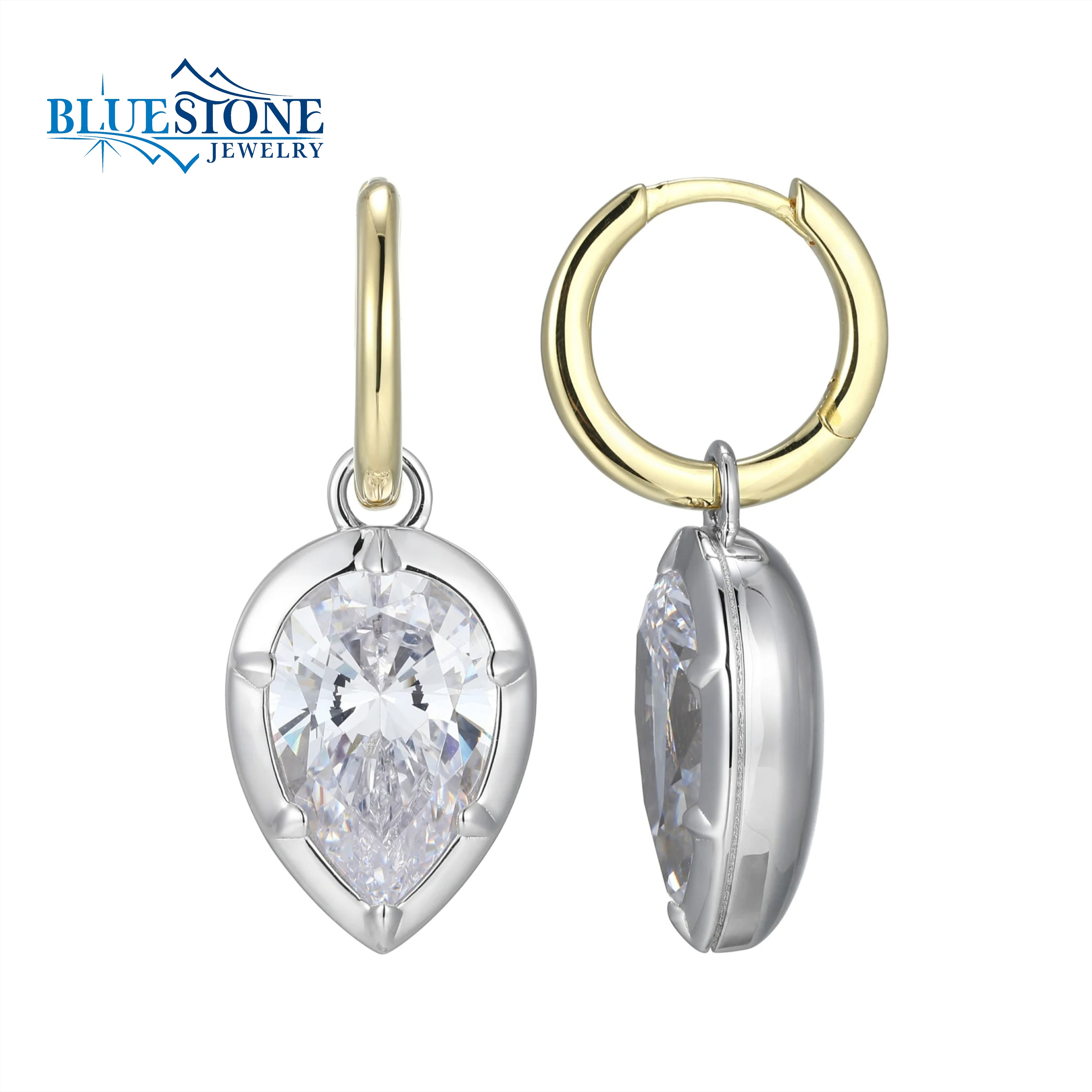 10 Karat Yelow Gold Plated Sterling Silver Huggy Hoop Earrings with Two 12mm x 8mm Pear Cut Cubic Zirconias. Earrings Measure 1" Long. CZ droplets can be removed so that hoops ca be worn separately.