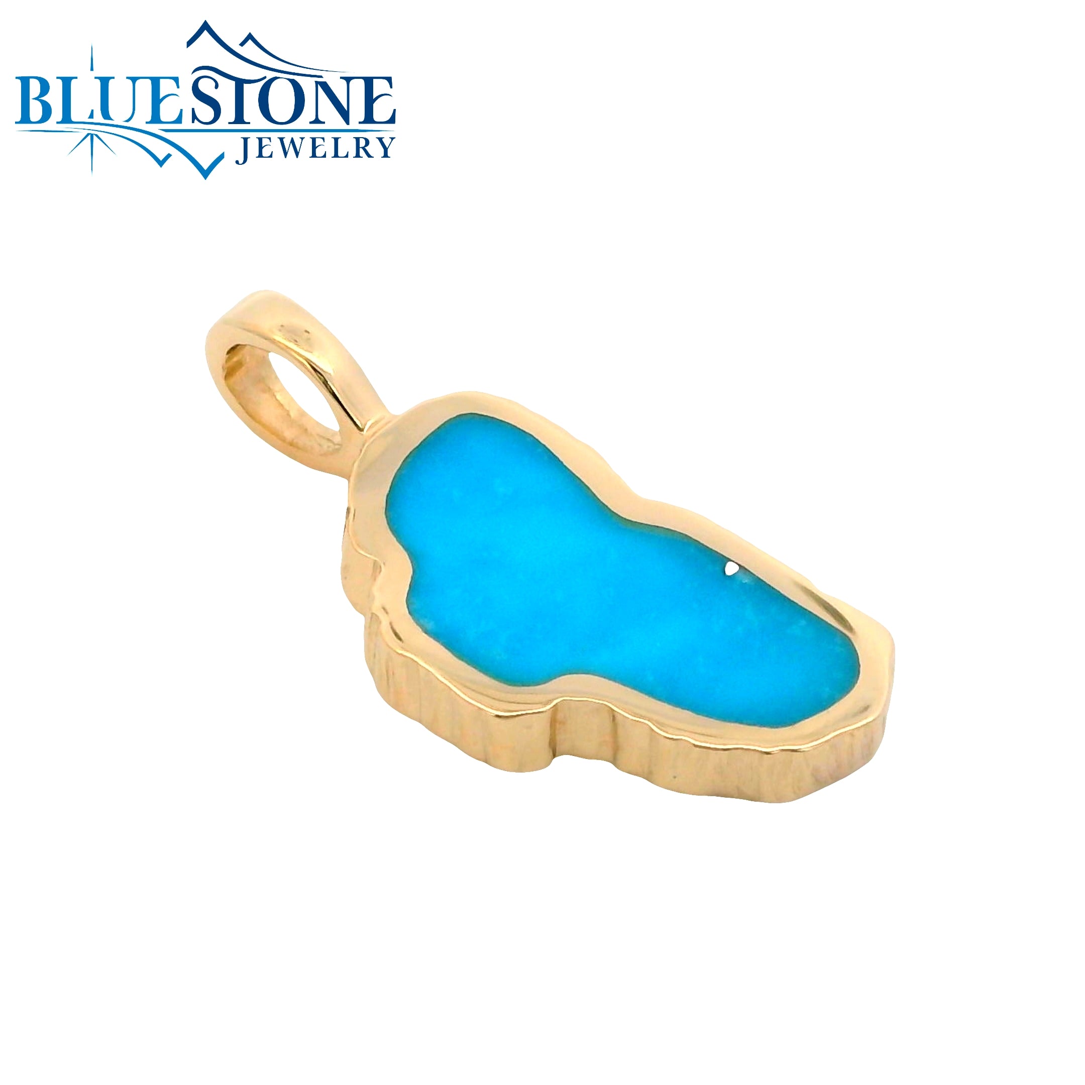 Large 14 Karat Yellow Gold Pendant with a Lake Tahoe Shaped Turquoise. Measures 1/2" x 1 1/8".Chain is sold separately. Comes on an 18" Yellow Plated Alloy DISPLAY Chain. Appearance of natural stone may vary from stock photo.