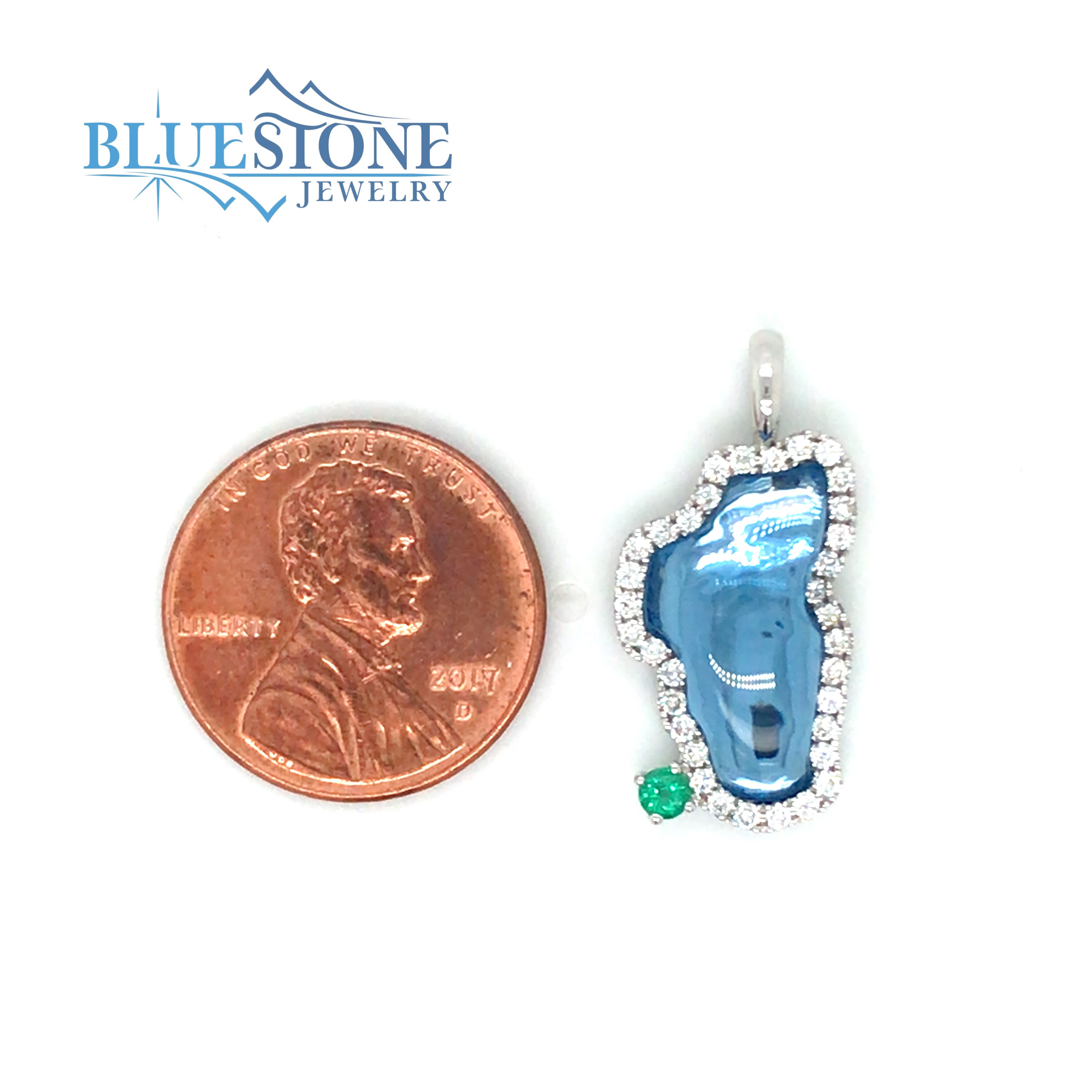 Large 14 Karat White Gold Lake Tahoe Pendant with a 3.50 Carat Hydro Blue Topaz, 34 Round Diamonds at 0.34 Carats Total Weight of G Si1 Quality Diamonds and One 2.5mm 0.07 Carat Round Natural Emerald at the Location of Emerald Bay, CA. Measures Approximately 1" x 1/2". Backed with 14 Karat White Gold to Enhance the Brilliant Color of the Hydro Blue Topaz. Exclusive Bluestone Jewelry Design.Chain is sold separately. Comes on an 18 inch metal alloy DISPLAY chain.