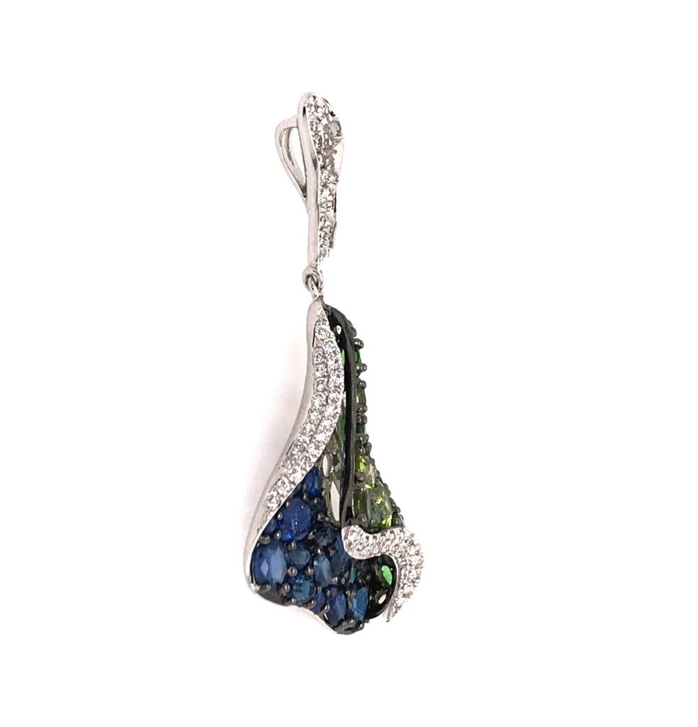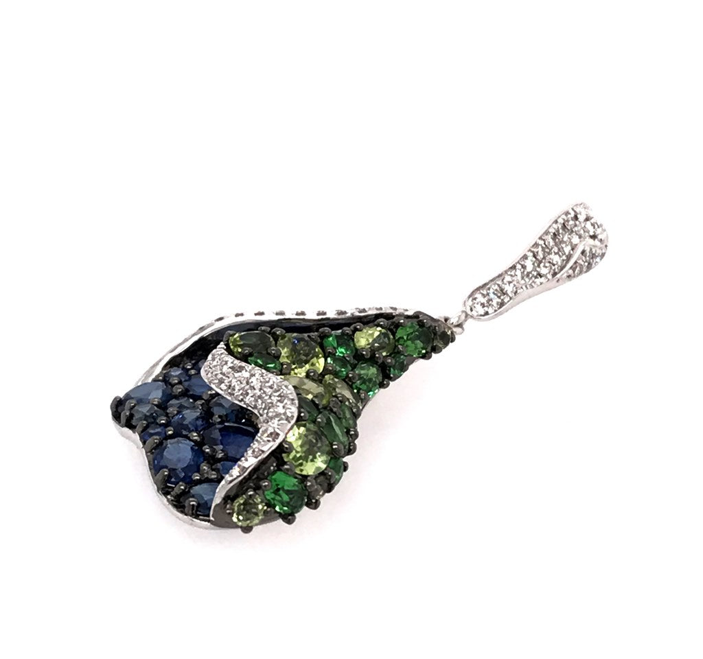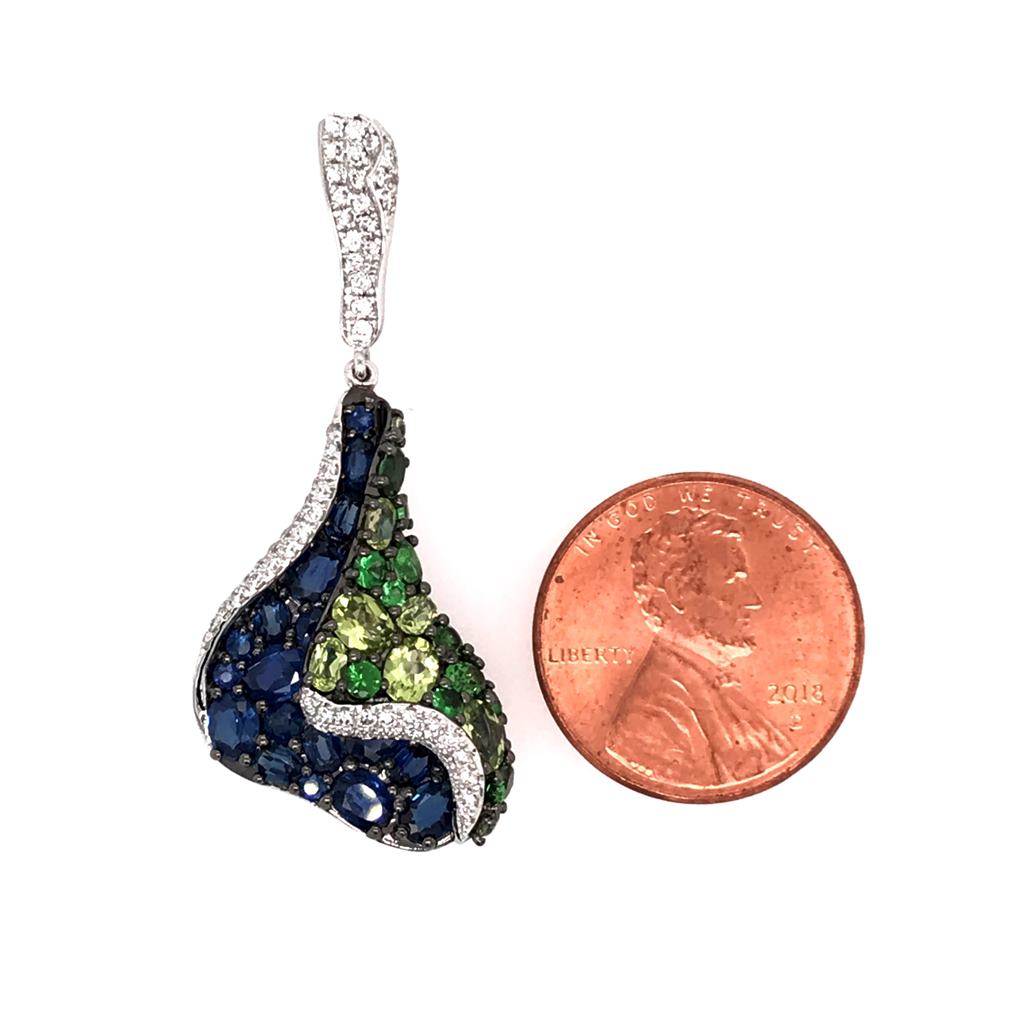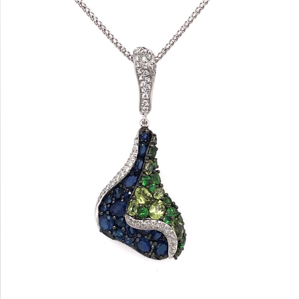 14 Karat White Gold Pendant with 22 Round and Oval Sapphires at 2.21 Carats Total Weight, 62 Round Diamonds at 0.36 Carats Total Weight G SI1, 9 Round and Oval Peridots at 0.82 Carats Total Weight and 11 Round and Oval Tsavorite Garnets at 0.61 Carats Total Weight.Chain is sold separately. Comes on an 18" metal alloy DISPLAY chain.