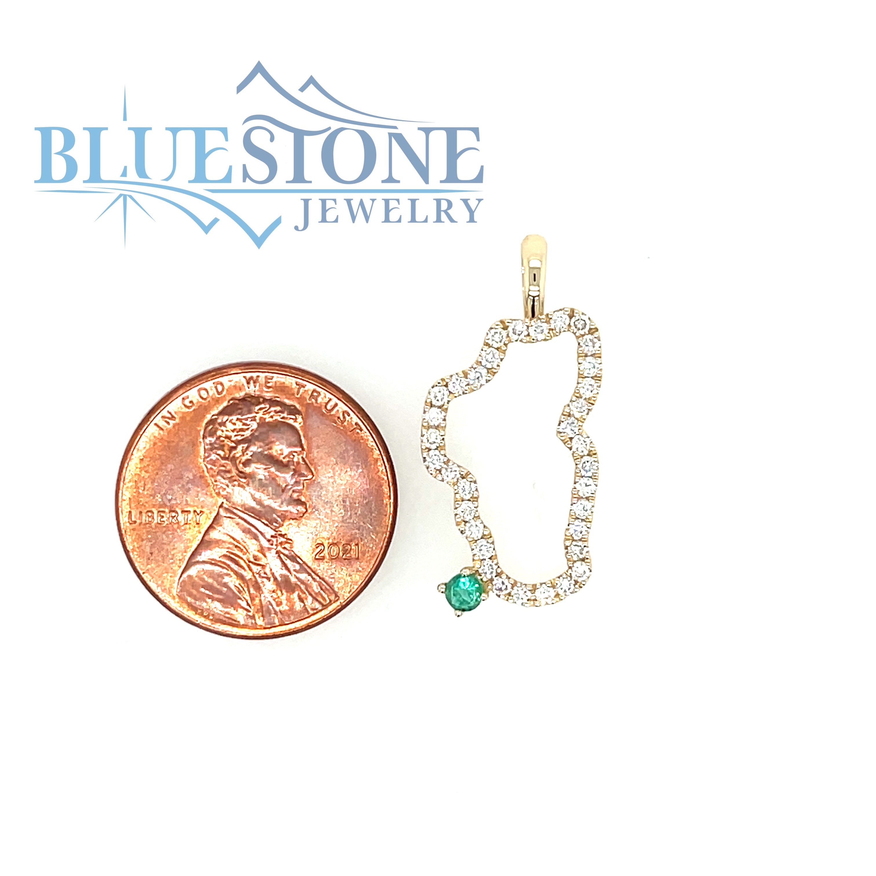 Large 14 Karat Yellow Gold Lake Tahoe Pendant with 34 Round Diamonds at 0.34 Carats Total Weight of G SI1 quality and 1 Round Emerald at 0.07 carat representing Emerald Bay, California. Measures 1/2 Inch by 1 inch.Chain is sold separately. Comes on a metal alloy DISPLAY chain.