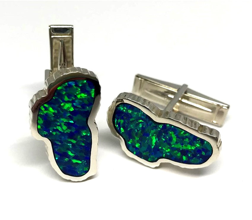 Large Sterling Silver & Stainless Steel Cufflinks with 2 Lake Tahoe Lab Grown Opals.Measures approximately 7/8 of an inch tall and 3/8 of an inch wide.