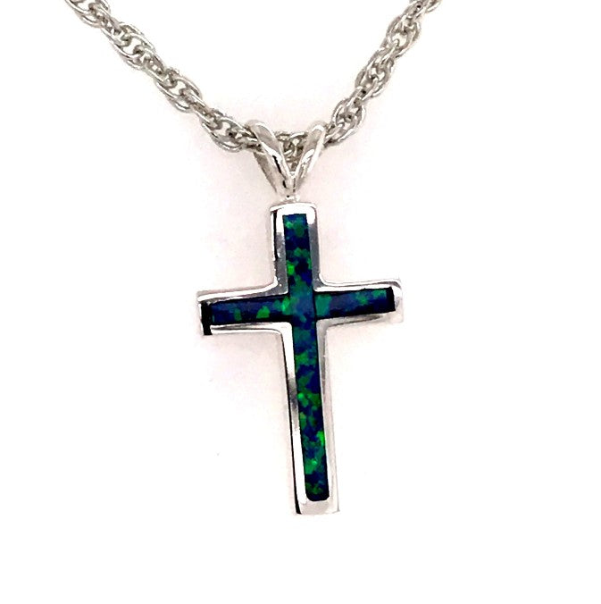 Large Sterling Silver Cross Pendant with Inlaid Synthetic Opal. Pendant Measures 1.25 Inch Length by .75 Inch Width.Chain is Sold Separately from Cross Pendant.