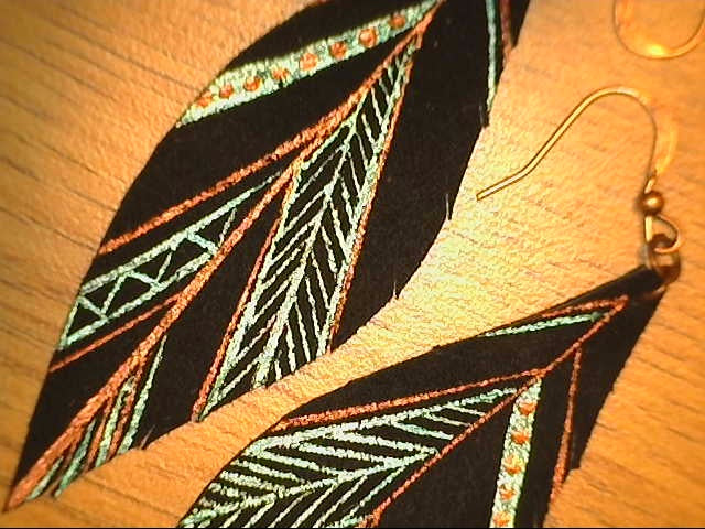 Maya Aztec Leather Feather Earrings with teal and bronze design with brass on black leather