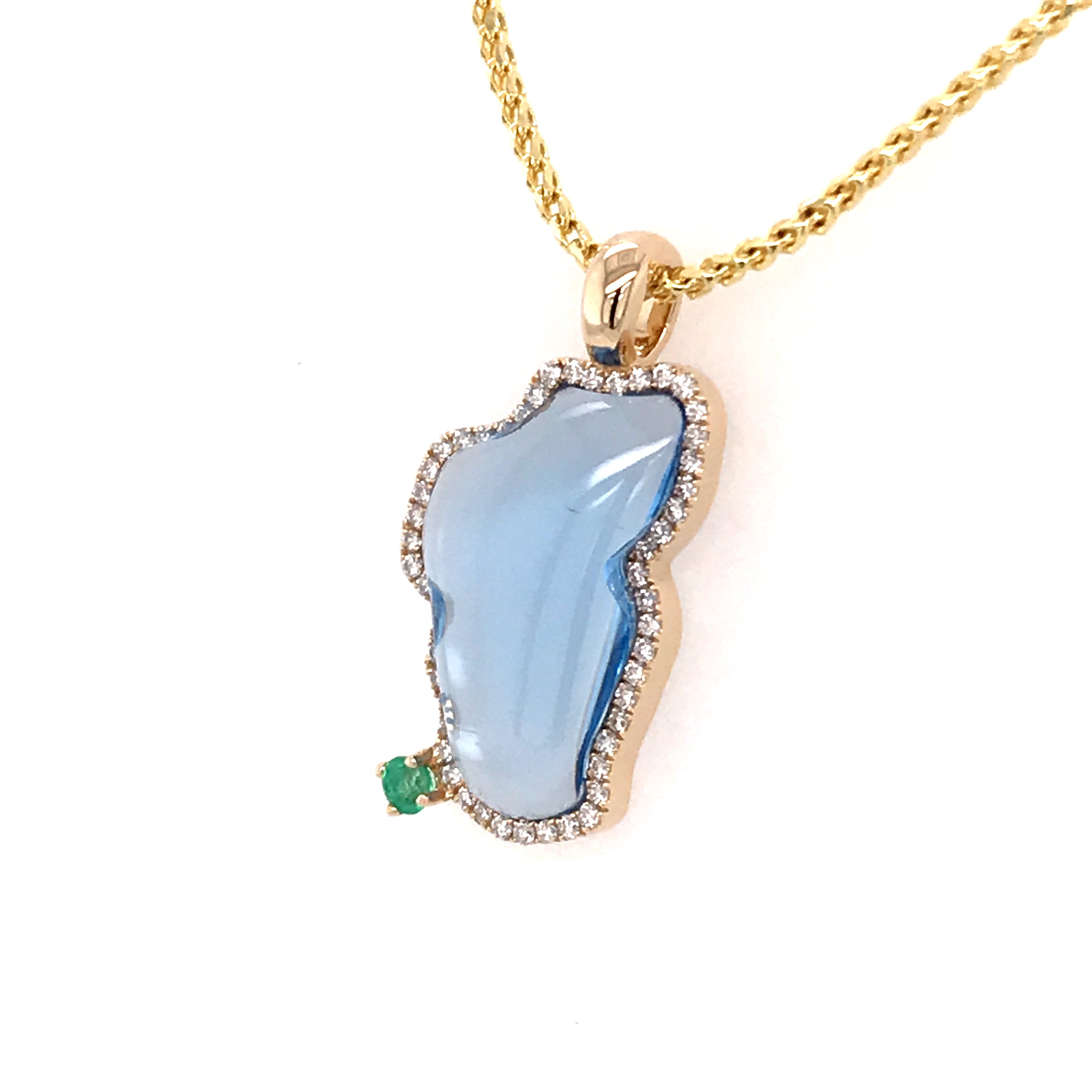 Medium 14 Karat Yellow and White Gold Pendant with a 3.22 Carat Lake Tahoe Shaped Light Blue Topaz Hydro Permanently Treated Gemstone, 51 Round Diamonds Surrounding Lake Tahoe at 0.14 Carats Total Weight of G SI1 Quality Diamonds and One Round 0.04 Carat Natural Emerald at the Location of Emerald Bay, CA. Pendant Measures Approximately 12mm x 21mm. Bluestone Jewelry Exclusive Design.