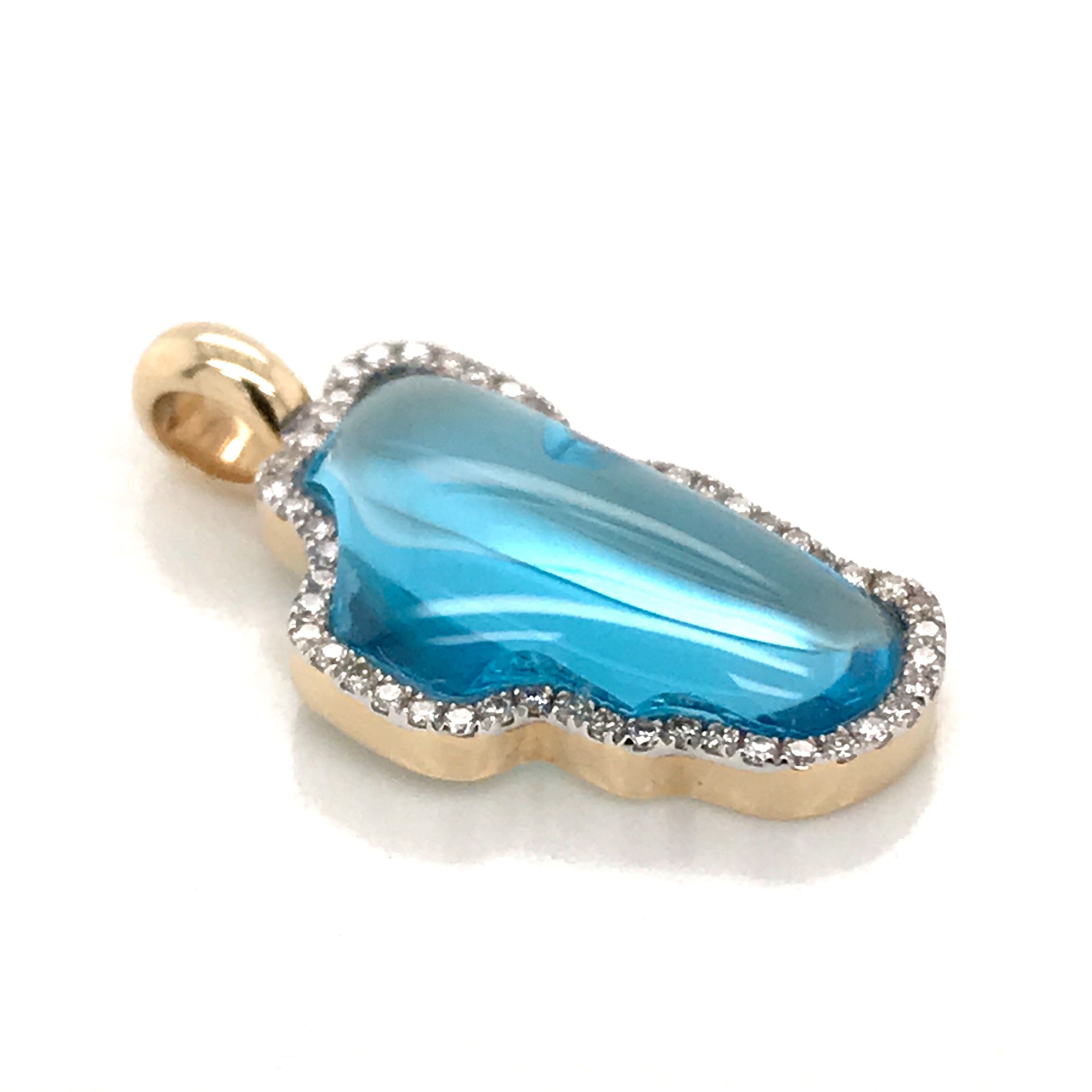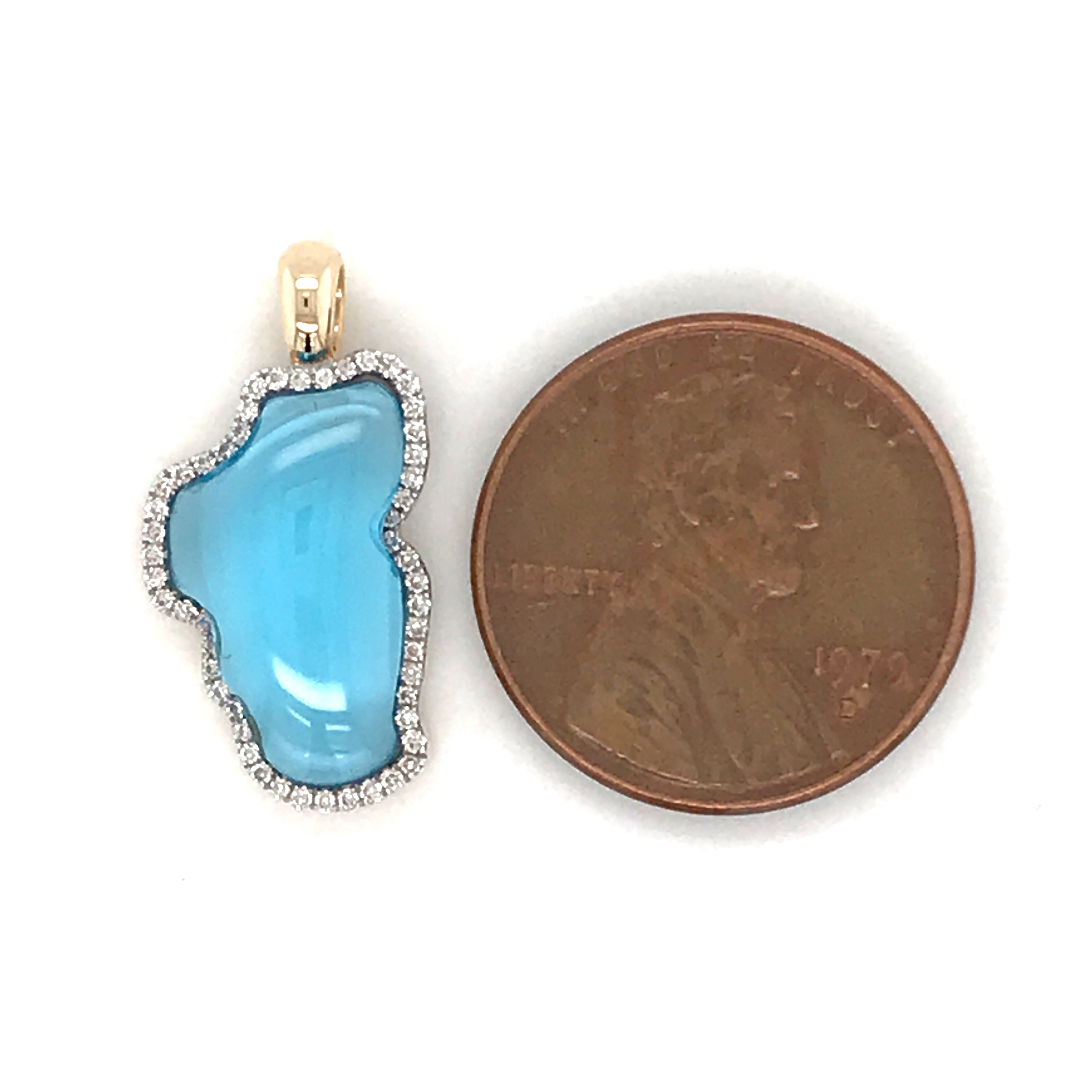 Medium 14 Karat Yellow and White Gold Pendant with a 3.22 Carat Lake Tahoe Shaped Light Blue Topaz Hydro Permanently Treated Gemstone & 51 Round Diamonds Surrounding Lake Tahoe at 0.15 Carats Total Weight of G SI1 Quality Diamonds. Bluestone Jewelry Exclusive Design.