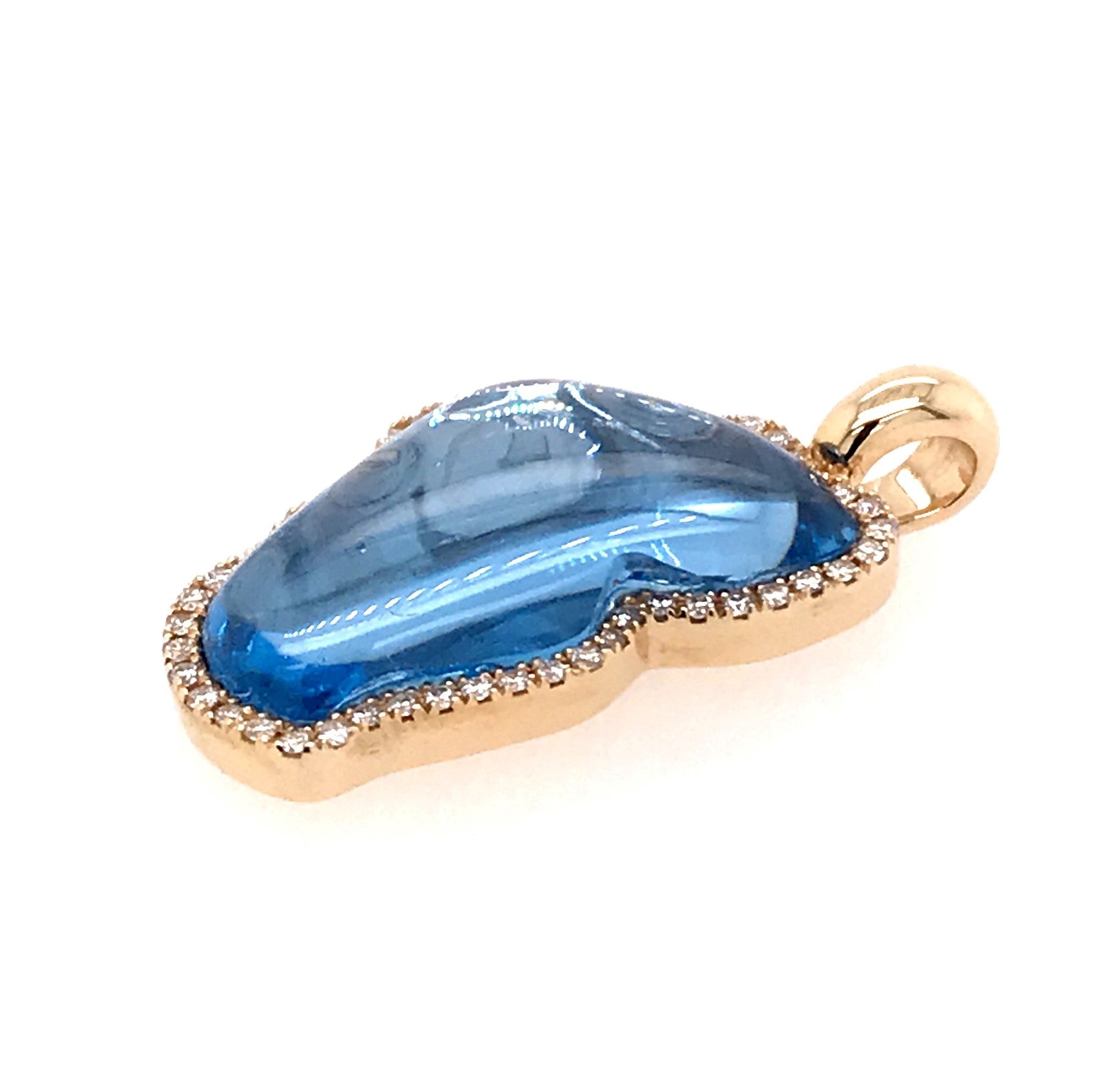 Medium 14 Karat Yellow Gold Pendant with a 3.44 Carat Lake Tahoe Shaped Light Blue Hydro Permanently Treated Gemstone & 51 Round Diamonds Surrounding Lake Tahoe at 0.15 Carats Total Weight of G SI1 Quality Diamonds. Backed with 14 Karat Yellow Gold to Enhance the Brilliant Color of the Hydro Blue Topaz. Pendant Measures Approximately 12mm x 21mm. Exclusive Bluestone Jewelry Collection.Chain is sold separately. Comes on an 18 inch metal alloy DISPLAY chain.