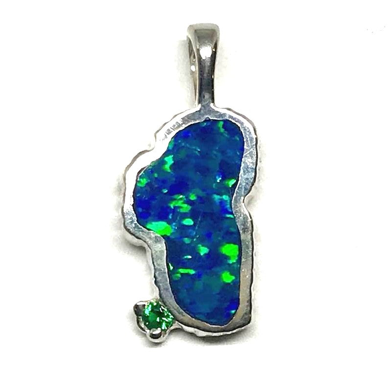 Medium 14 Karat White Gold Lake Tahoe Pendant with Lab Grown Opal & a Round Emerald.Measures 5/8th of an Inch tall.Comes on an 18" yellow plated alloy display chain. It is highly recommended to switch onto a different chain before wearing.