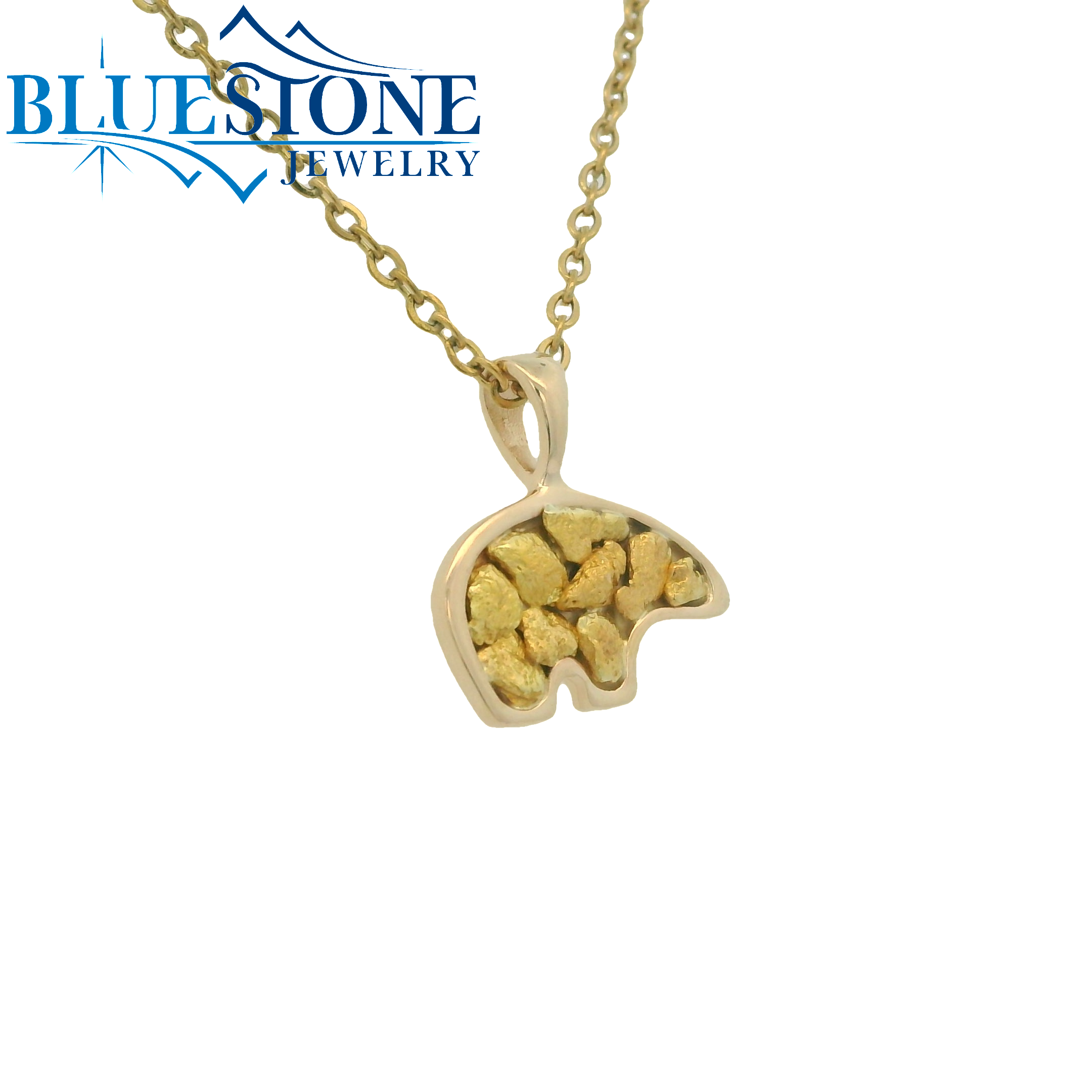 Medium 14 Karat Yellow Gold Bear Pendant with 24 Karat Gold Nuggets.Measures 5/8 inch top to bottom and 5/8 inch wide.Made in California. Comes on 18" Yellow Plated Display Chain