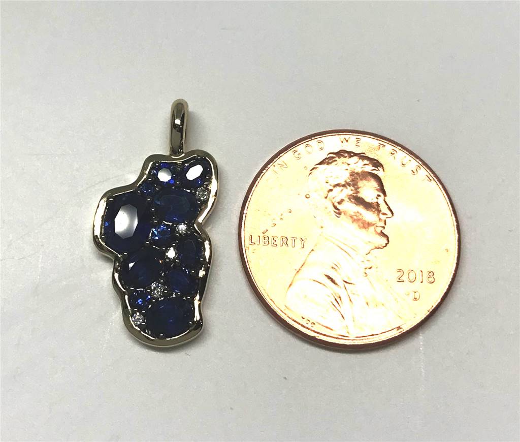 14 Karat Yellow Gold Medium Lake Tahoe Pendant with 11 Blue Sapphires at 1.52 Carats Total Weight & 5 Round Diamonds at 0.03 Carats Total Weight of G SI1 Quality Diamond.Bluestone Jewelry Design
