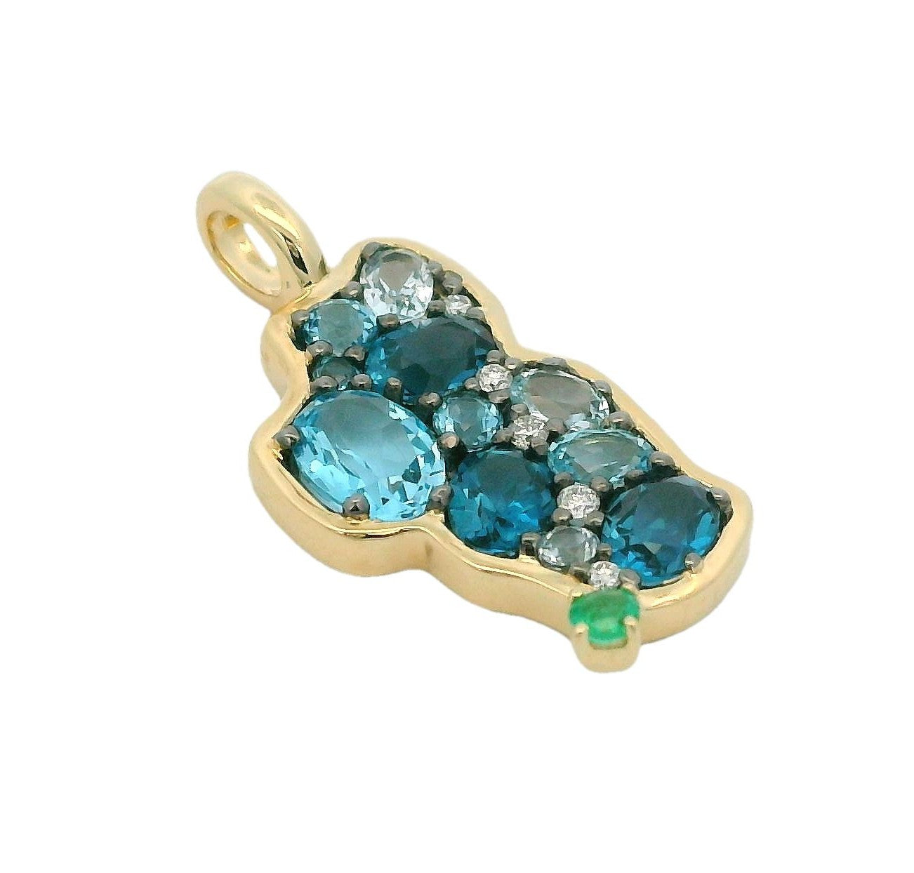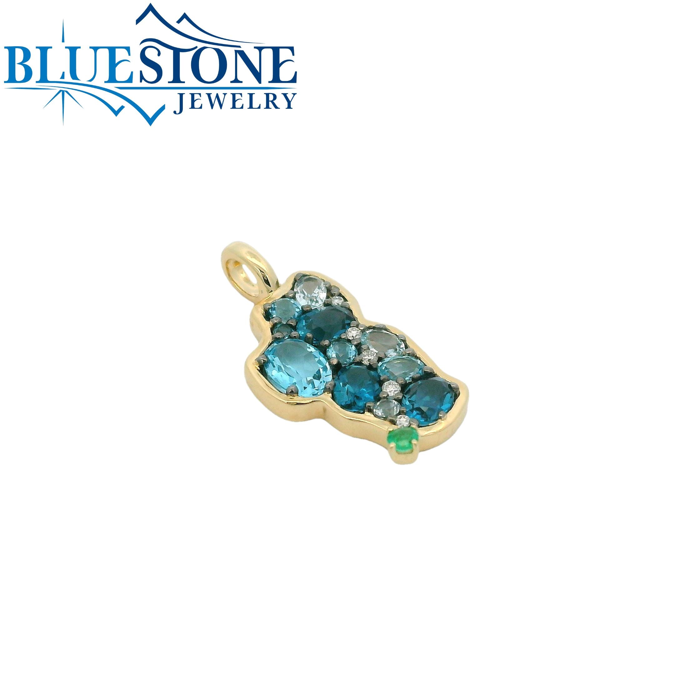 14 Karat Yellow Gold Medium Lake Tahoe Pendant with London Blue Topaz, Sky Blue Topaz, Swiss Blue Topaz at a Combined Total Weight of 1.34 Carats, One 0.03 Carat Round Emerald & 5 Round Diamonds at 0.03 Carats Total Weight of G/SI1 Quality Diamonds.Exclusive Bluestone Jewelry Design.