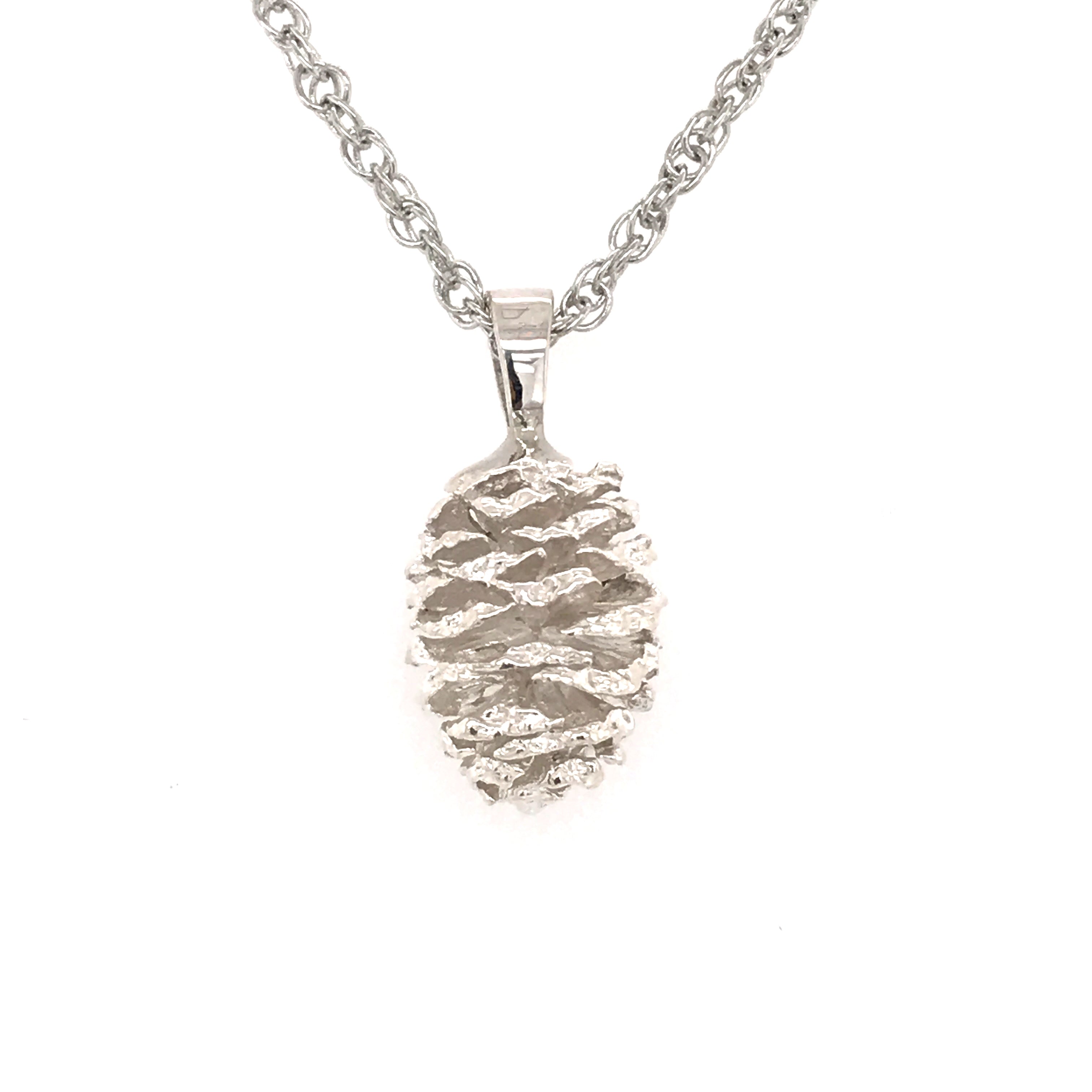 Medium Sterling Silver Alder Pine Cone Pendant.We find these Alder Pine Cones along the Truckee River and around Tahoe Streams. All pine cones are slightly different from one another. Pine cone's appearance may vary from picture.Comes on a metal alloy display chain. It is highly recommended to switch pendant over to a new chain before wearing.