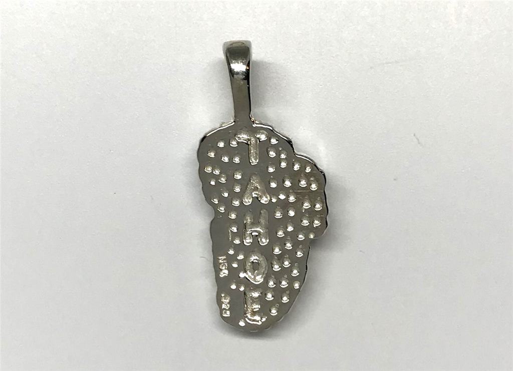 Medium Sterling Silver Lake Tahoe Pendant with Turquoise.Measures approximately 5/8 of an inch tall and 5/16 of an inch wide. Comes on 18 inch alloy display chain. (It is recommended to switch onto another chain for wear.)