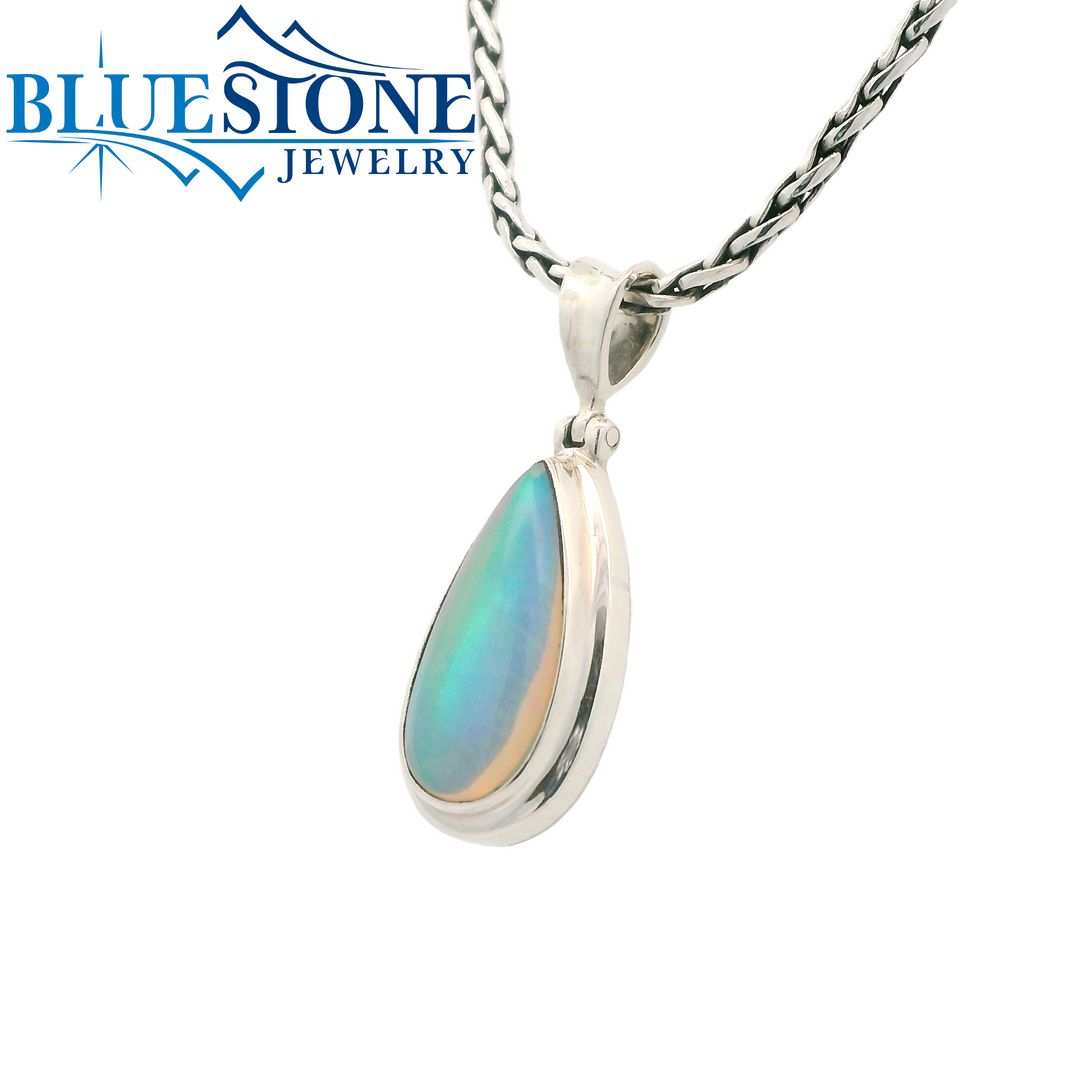Medium Sterling Silver Pendant with One 1.25" x 0.5" Teardrop Cut Ethiopian Opal on a Fine Handwoven Sterling Silver Chain, 19 Inches in Length.Local Lake Tahoe Designer.