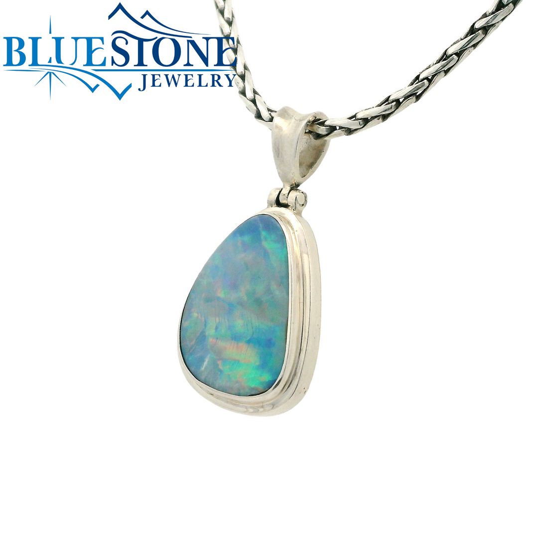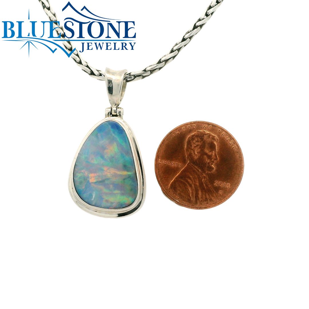 Medium Sterling Silver Pendant with One Australian Opal. Pendant Measures Approximately 1.25" x 0.6". Comes on a Handwoven Sterling Silver Chain, 16 Inches in Length.Local Lake Tahoe Designer.