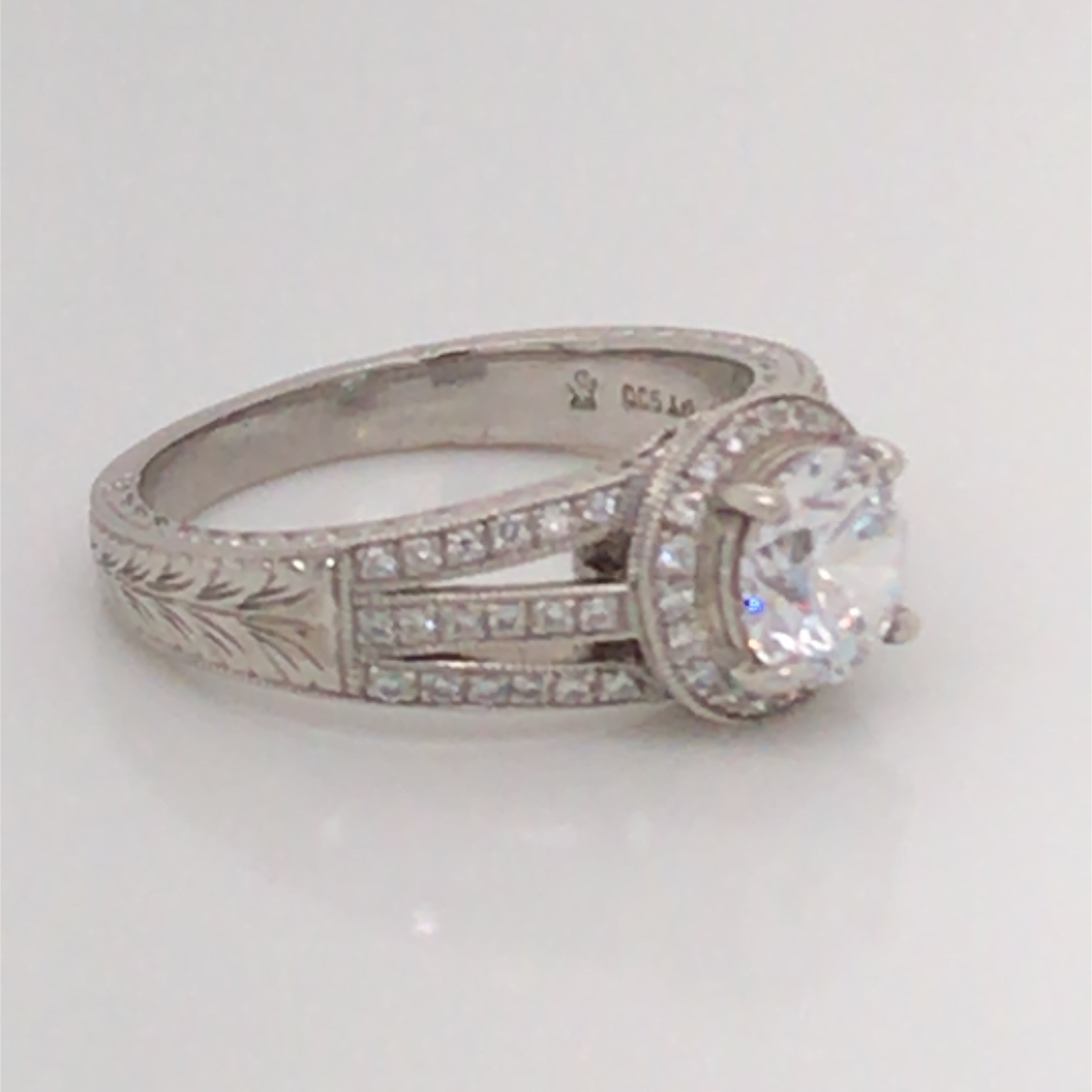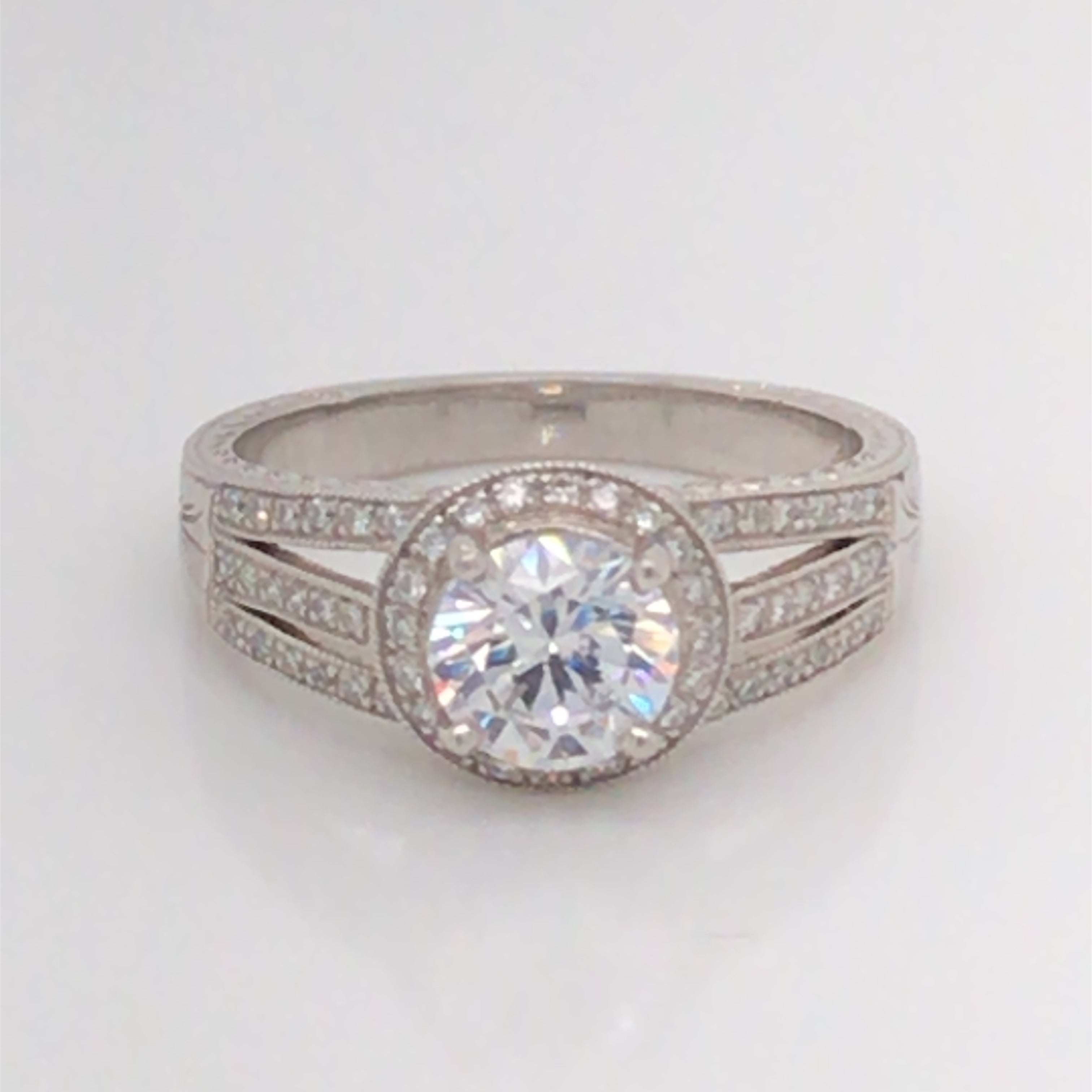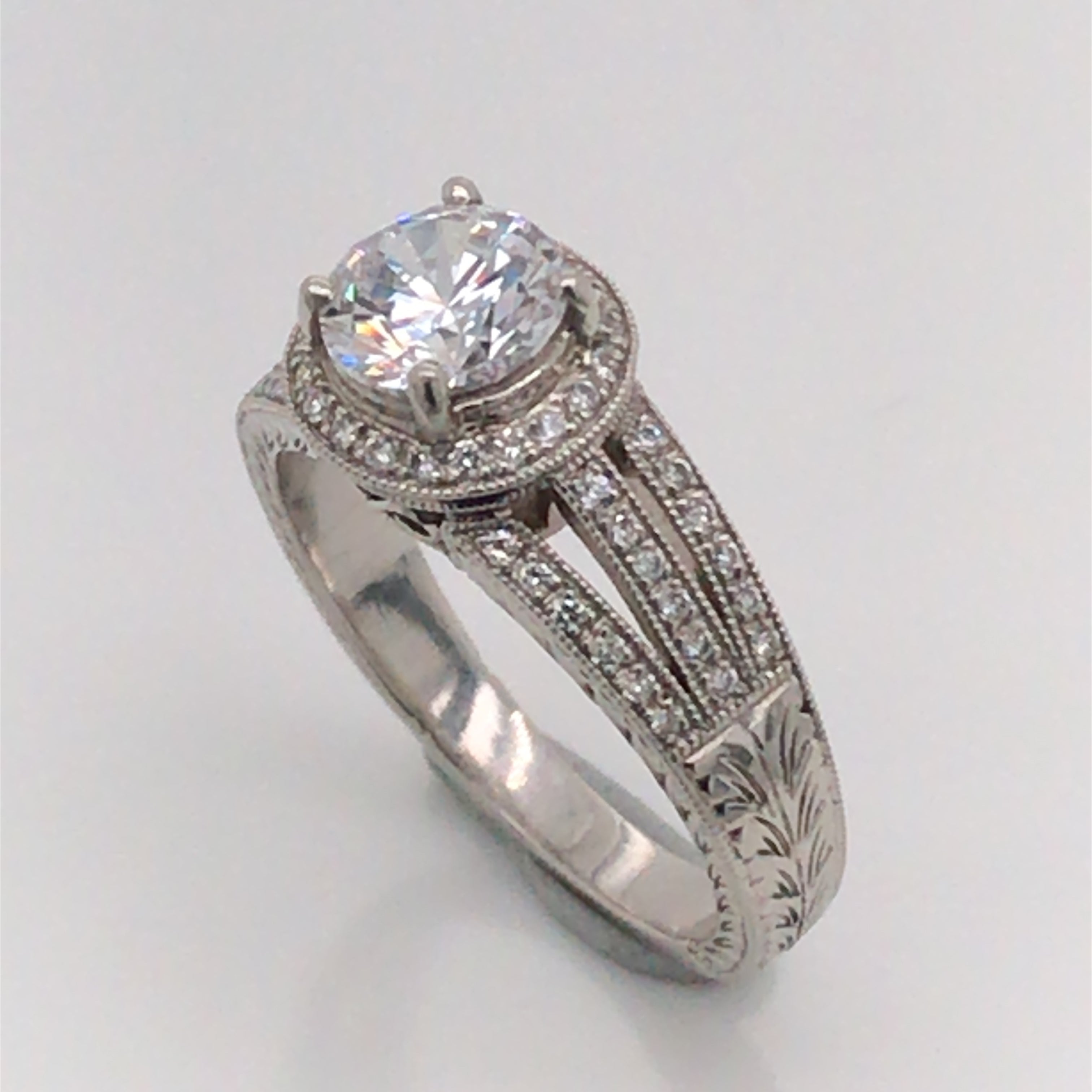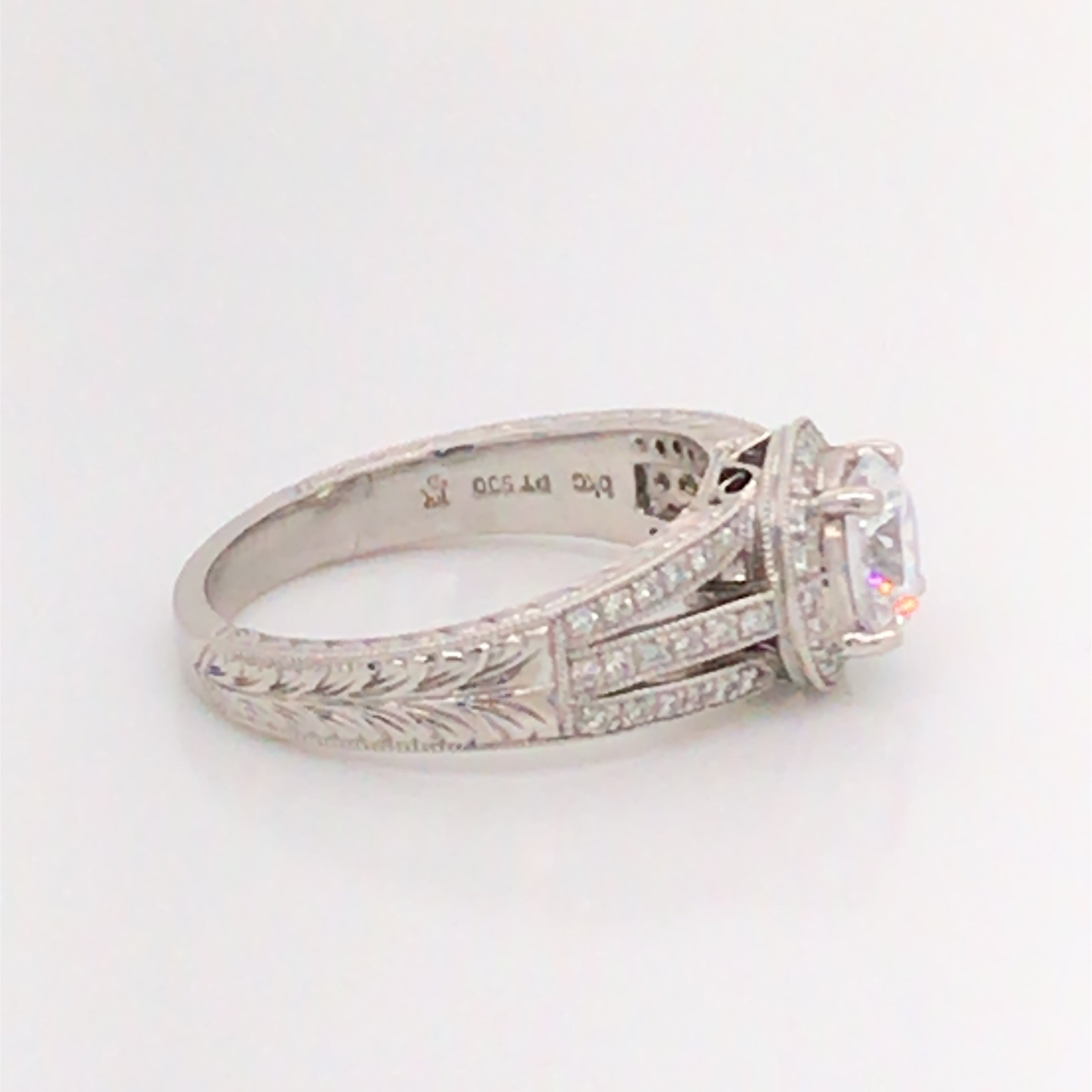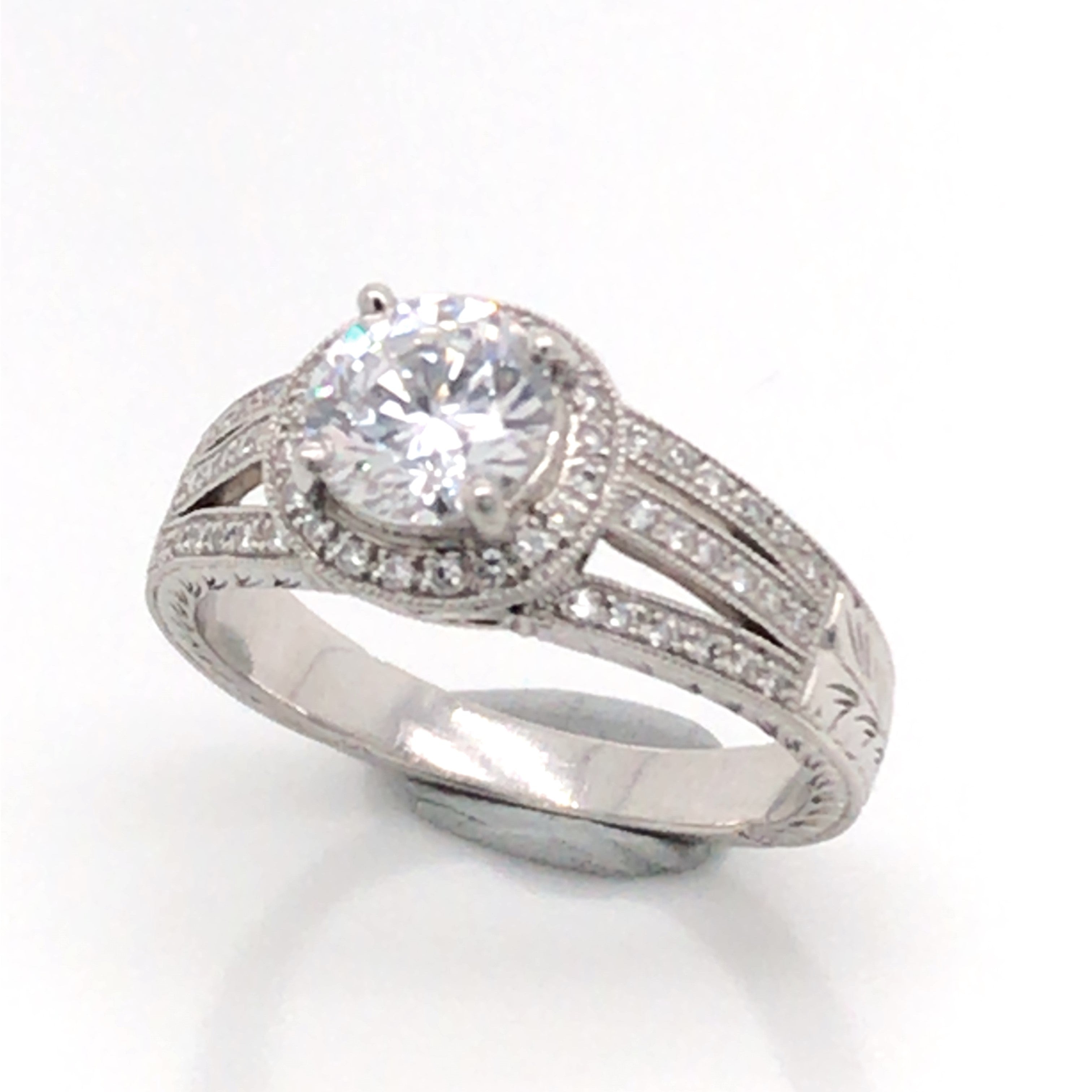 Platinum Engraved Engagement Ring with a 6.5mm Round Cubic Zirconia (size of a 1 carat round diamond) & 0.22 Carats Total Weight of Round G SI1 Quality Diamonds.Ring Size 6.5**50% OFF**BLUE DOT ITEM