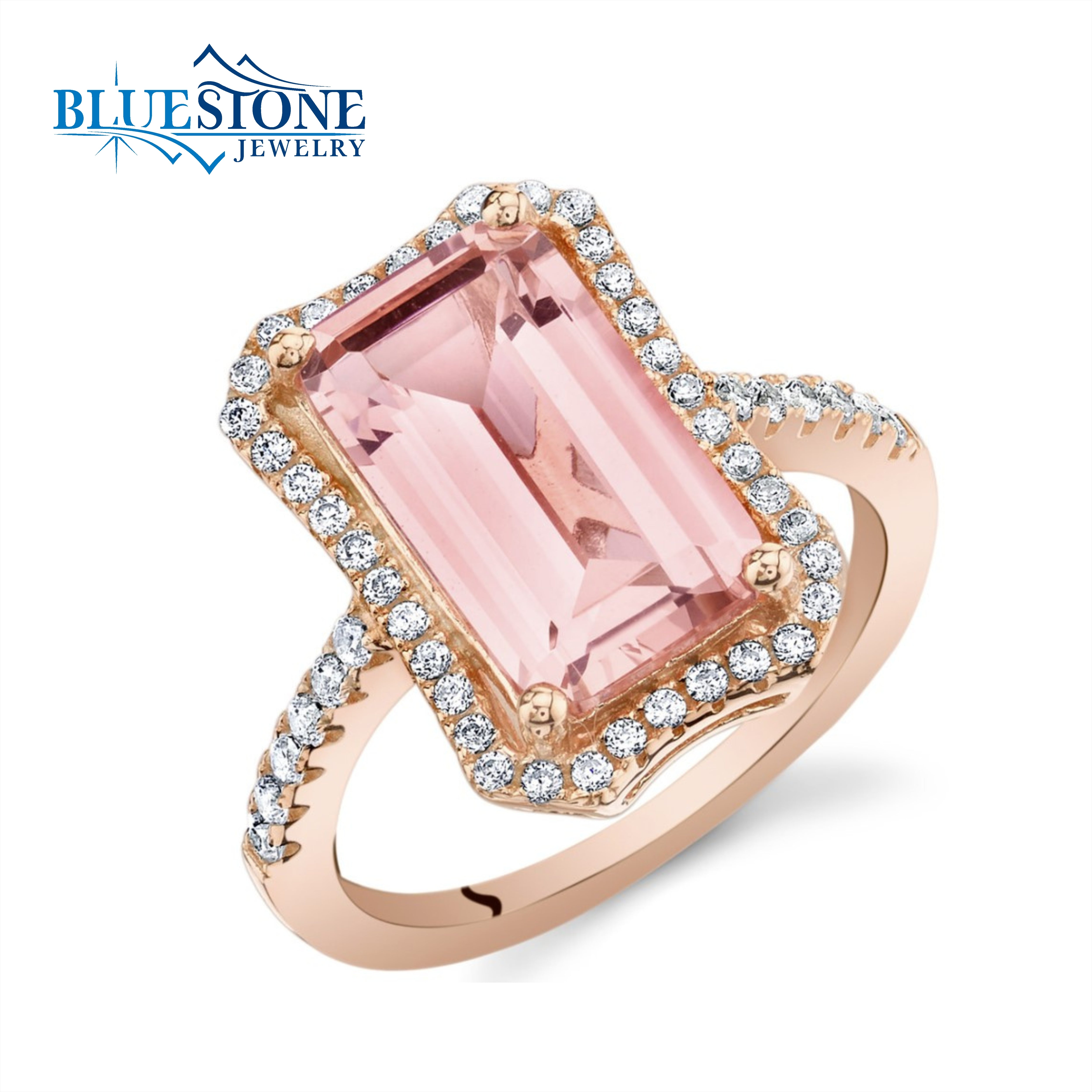 Sterling Silver with 14 Karat Rose Gold Plating Ring with One 4.00 Carat 7mm x 12mm Emerald Cut Simulated Morganite and Cubic Zirconia Accents. Ring Size 6.Other Ring Sizes are Available.
