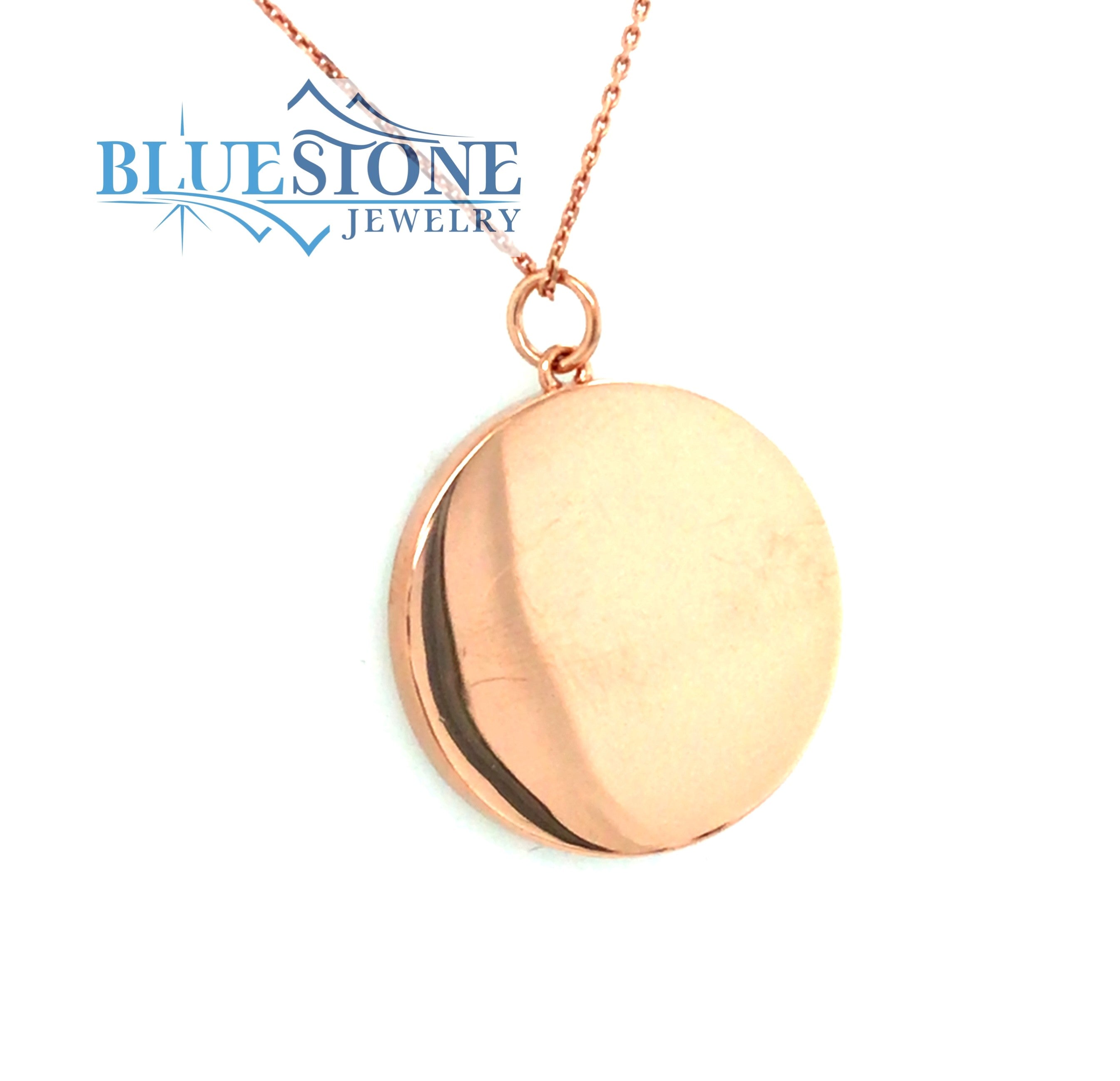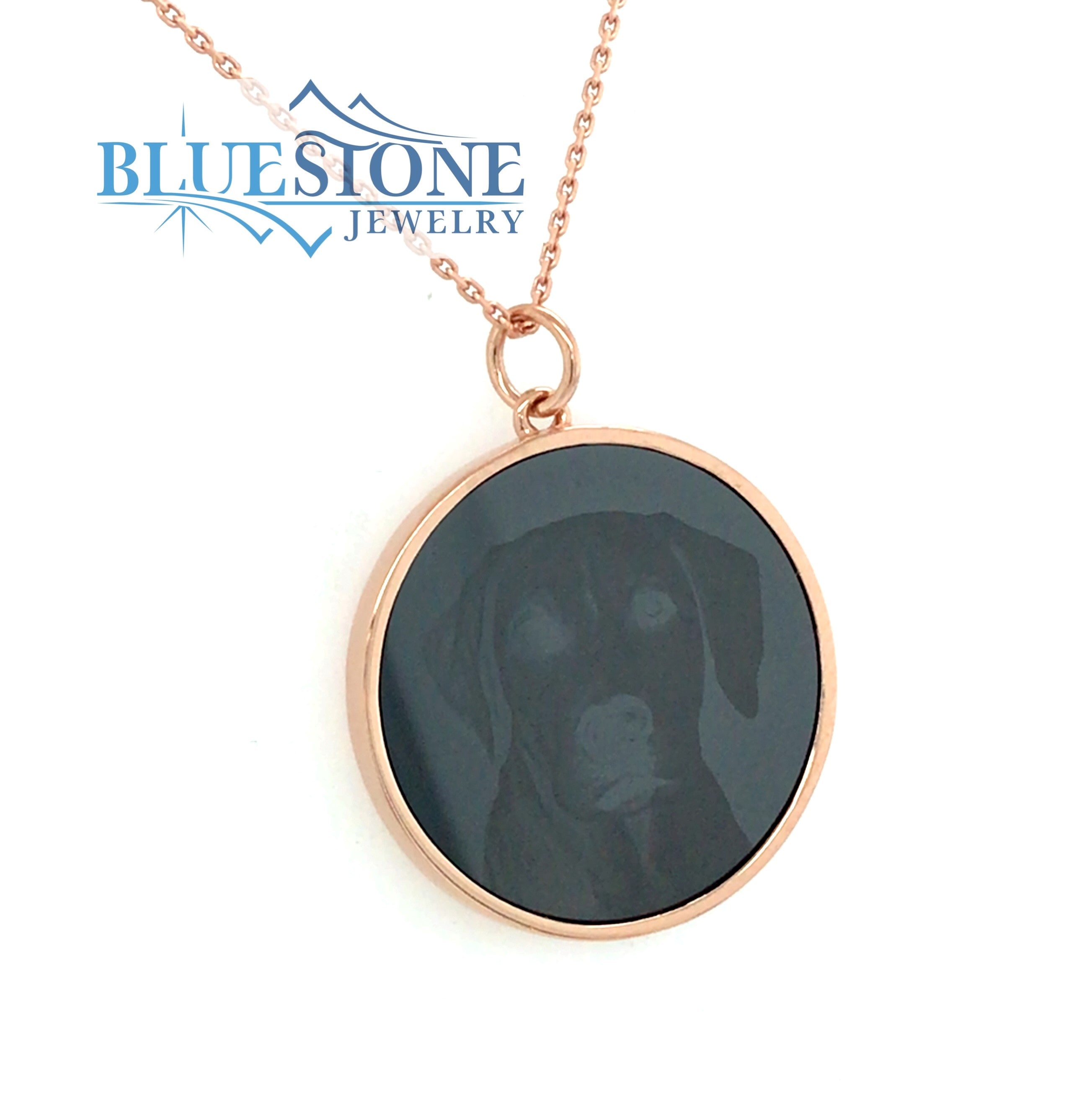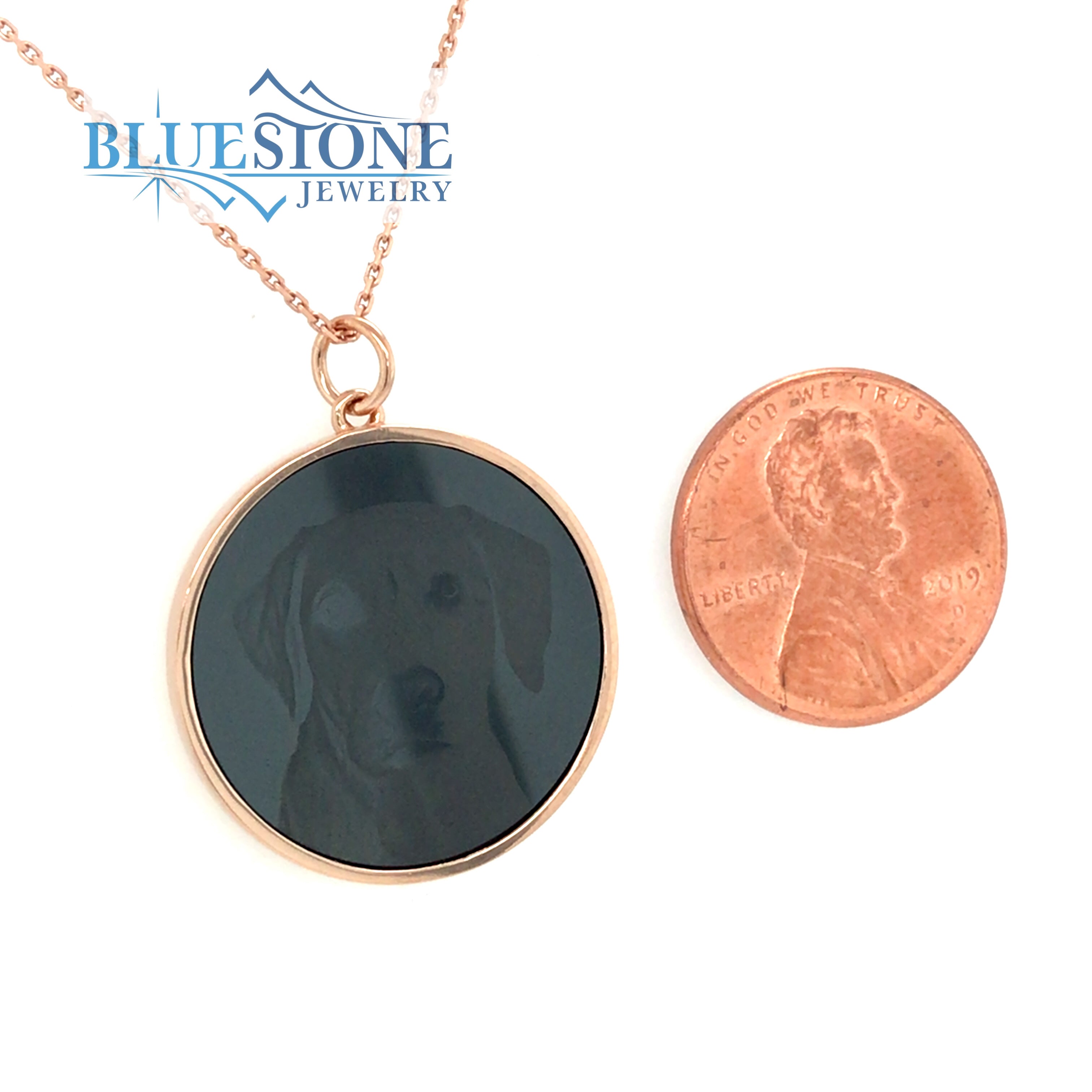 SAMPLE of our 14 Karat Rose Gold Pendant with a 21mm Round Black Diamond that can be custom engraved. This one has an example of an engraved Labrador Retriever.Priced with a 18 inch 14K Rose Gold Chain.SPECIAL ORDER ONLYCan be made in the following options:Silver with Rhodium Plating (no engraving) $749Silver with Rhodium Plating and custom engraving $824Silver with Yellow Gold Plating (no engraving) $838Silver with Yellow Plating and custom engraving $91314 Karat White, Yellow or Rose Gold (no engraving) $1,79914 Karat White, Yellow or Rose Gold and custom engraving $1,874