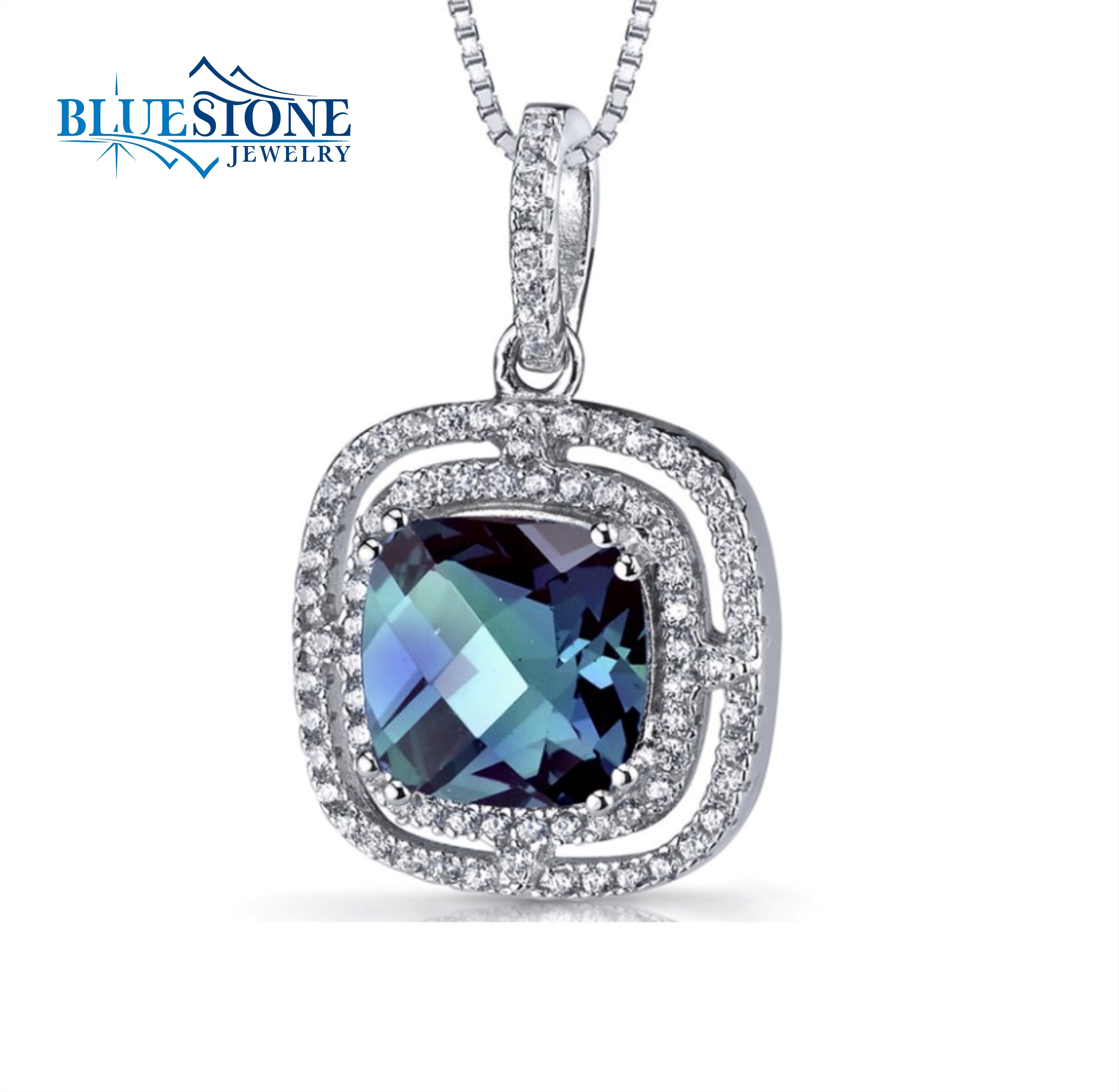 Sterling Silver Rhodium Plated Pendant with One 4.0 Carat Cushion Cut Color Changing Lab Created Alexandrite and Cubic Zirconias. Pendant Measures 1" x 5/8" Wide. Comes on an 18 Inch Sterling Silver Box Chain.Alexandrite exhibits Brilliant Sparkle and a changes Color from Green Blue to Purple hue.