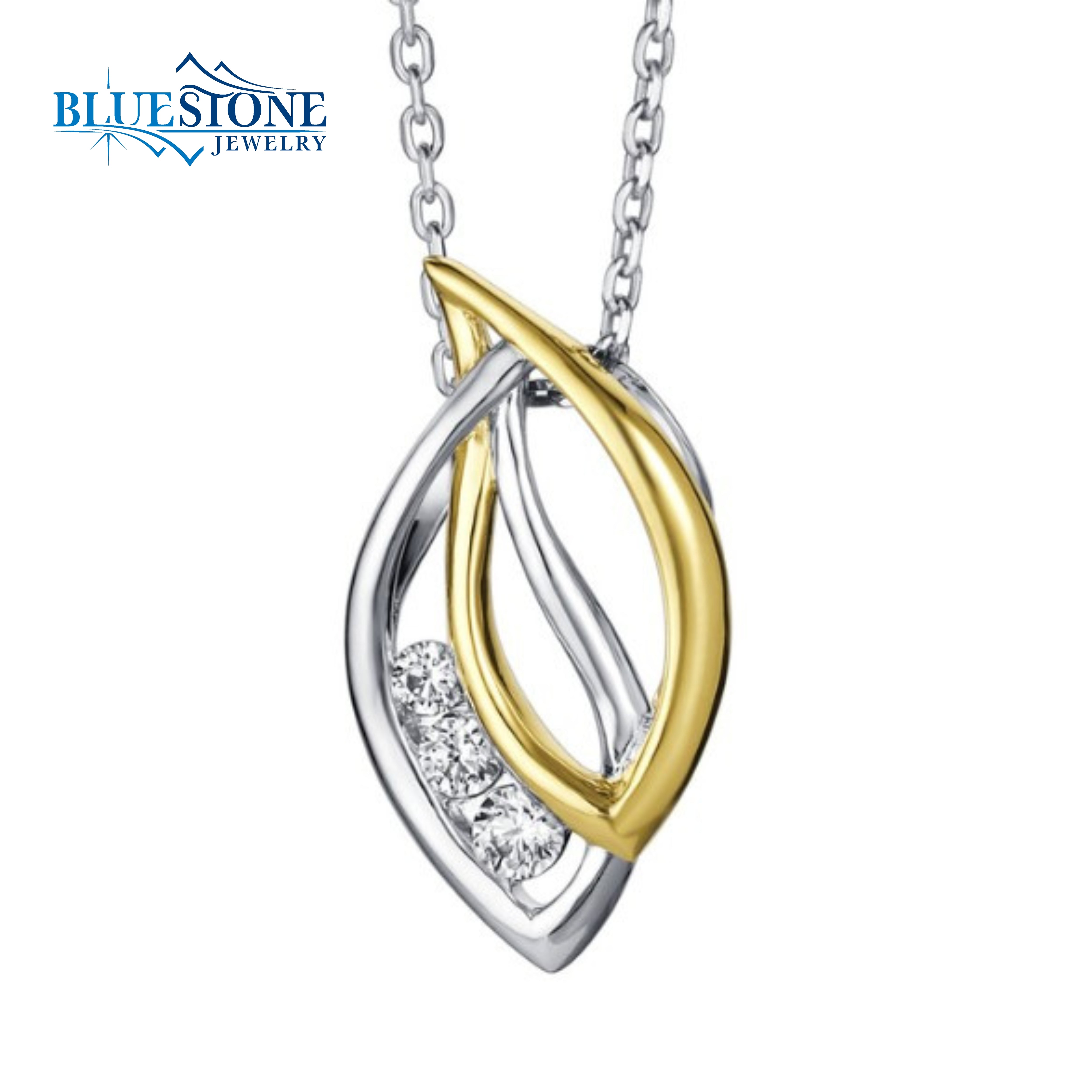 Two-Tone Sterling Silver and 14 Karat Yellow Gold Plated Pendant with Three Round Cubic Zirconia. Comes on an 16 Inch Sterling Silver Box Chain.