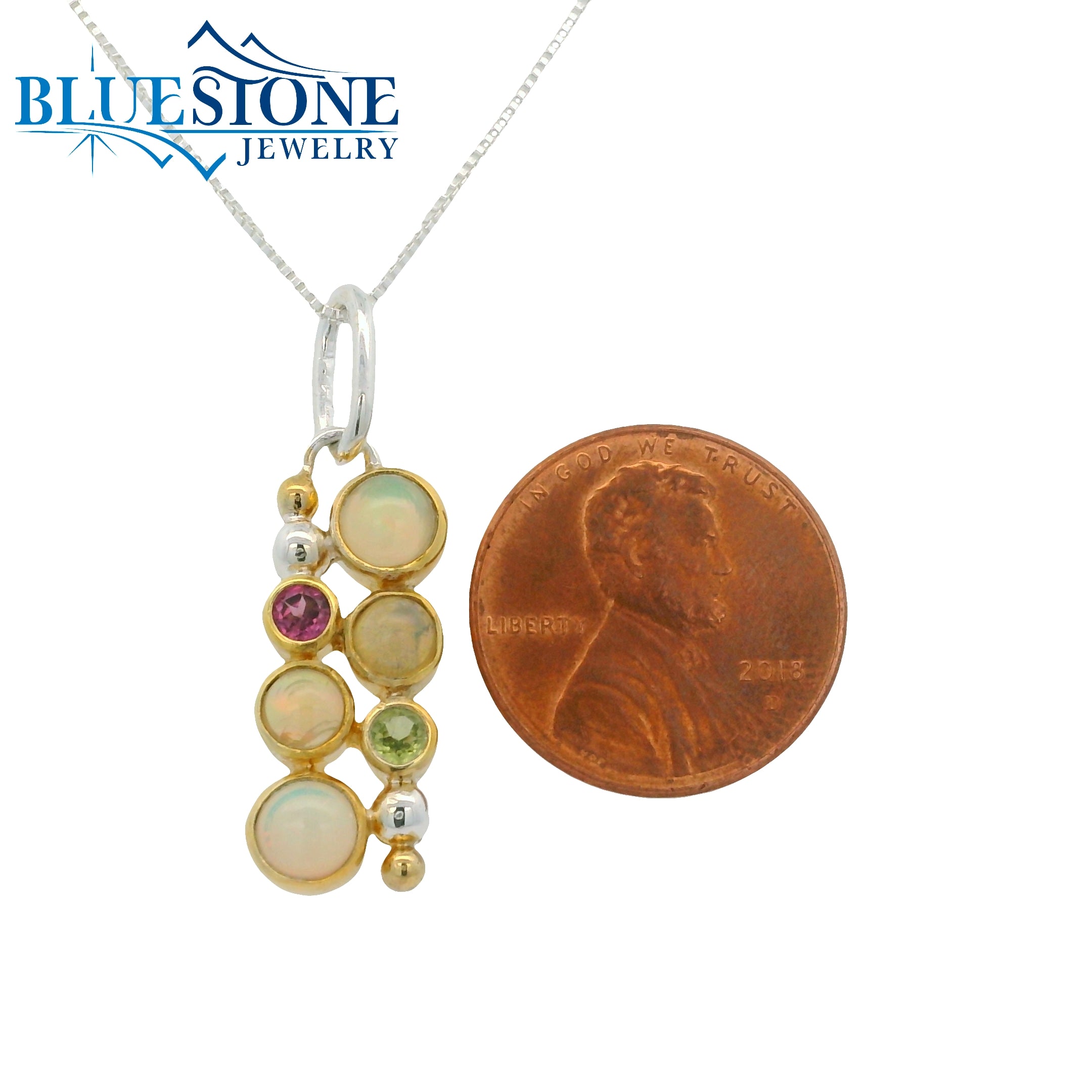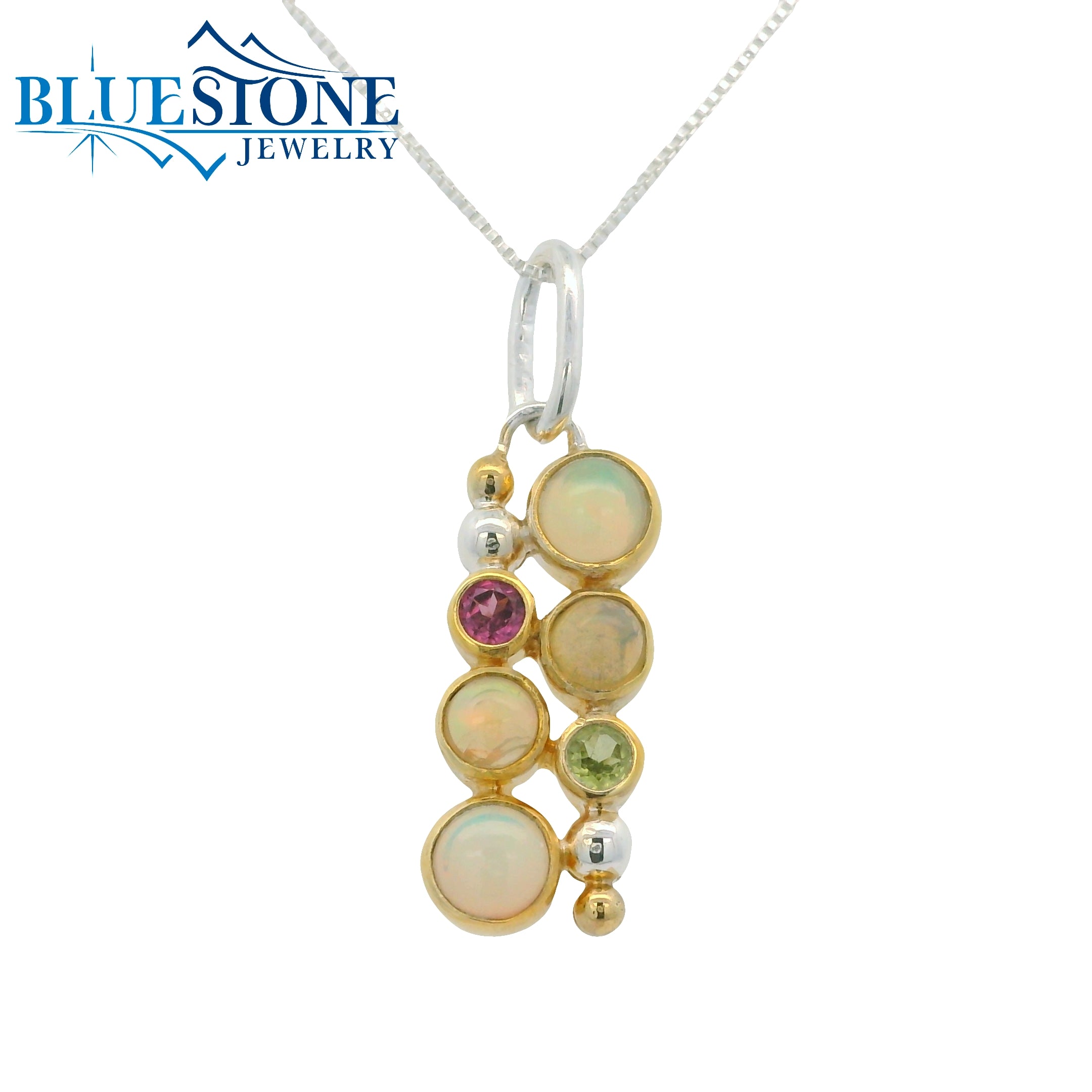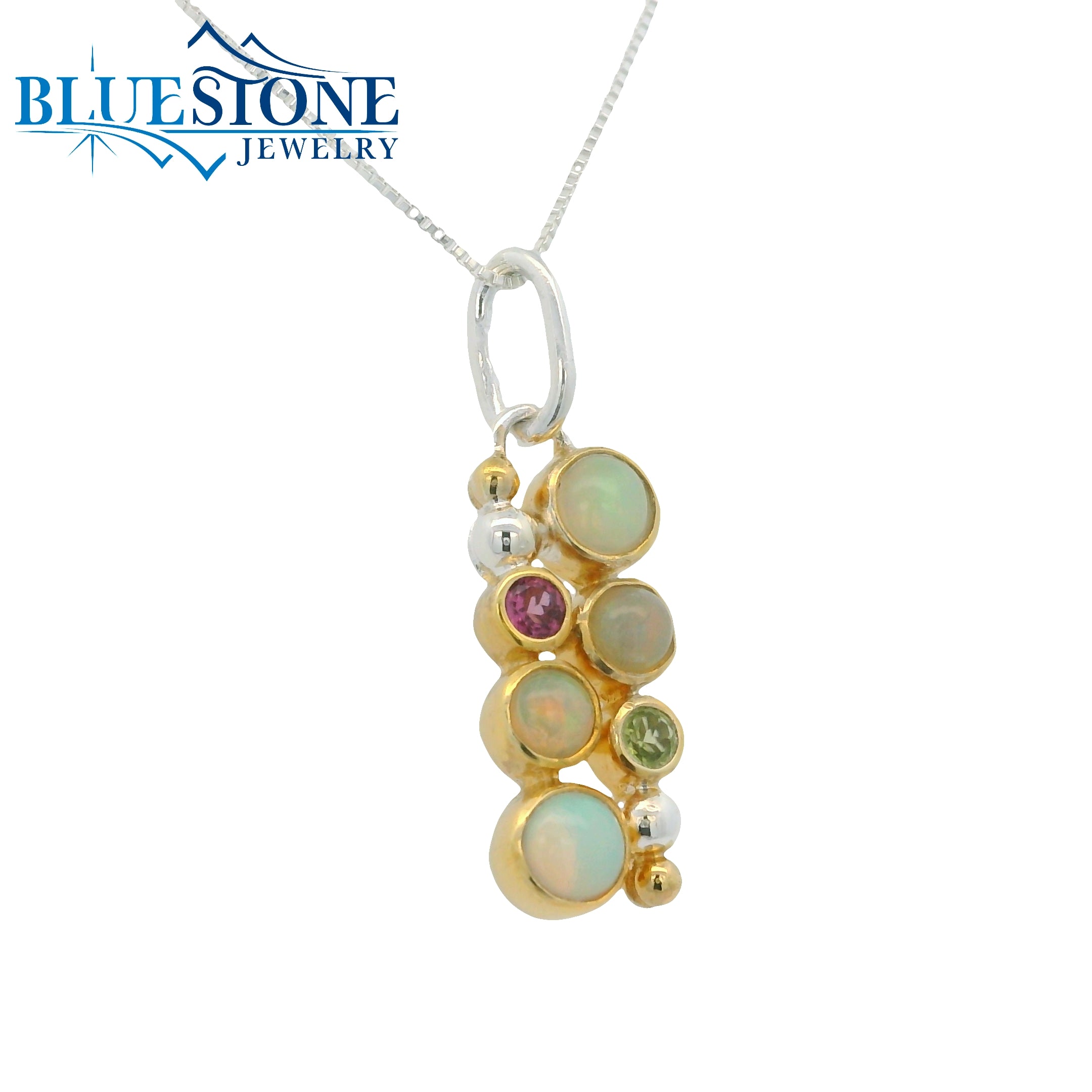 Sterling Silver and 22 Karat Yellow Gold Vermeil Pendant with 4 Ethiopian Opals, 1 Peridot and 1 Rhodolite Garnet. Measures 1.25" Long. Comes on an 18 Inch Sterling Silver Box Chain. Local Lake Tahoe Artist Michou.