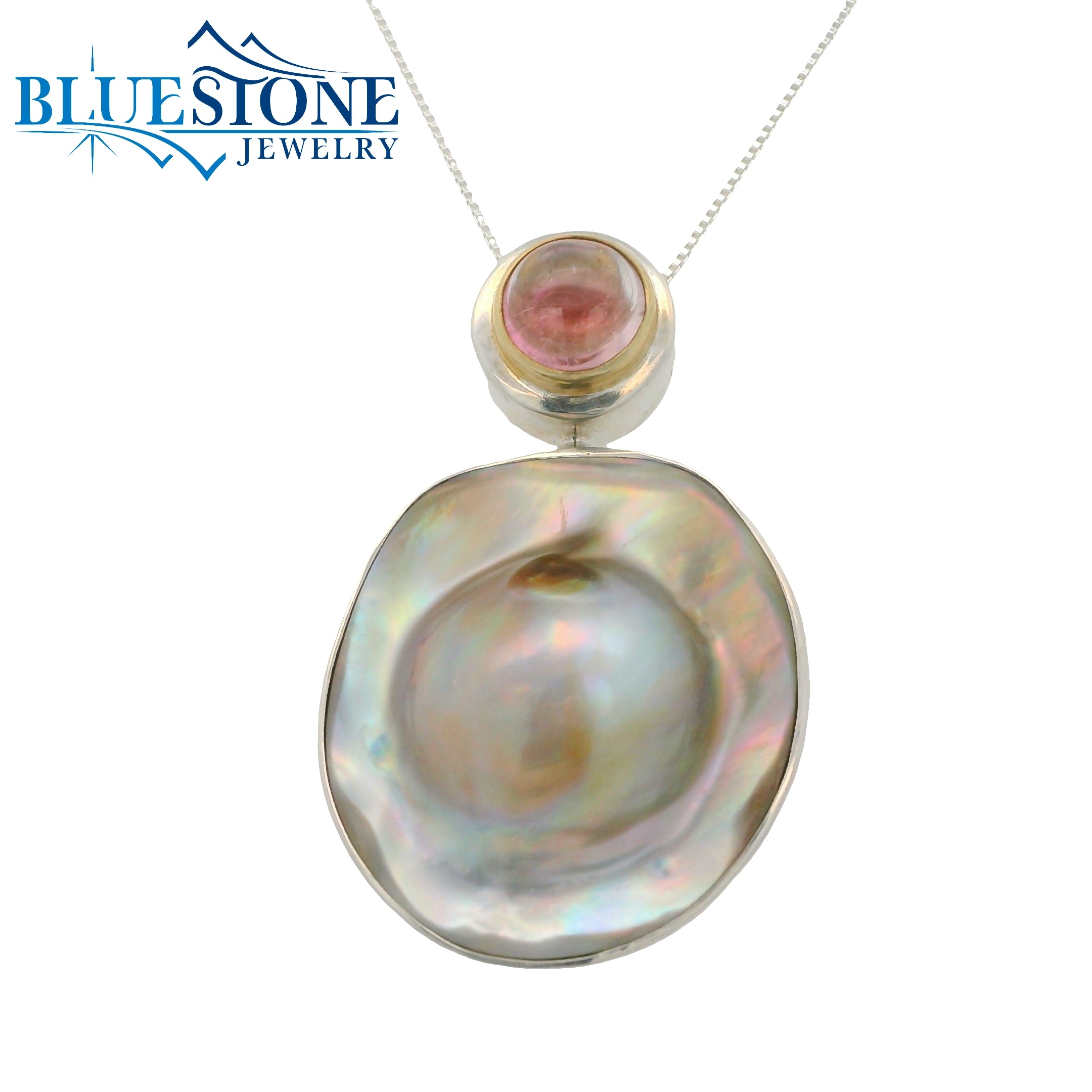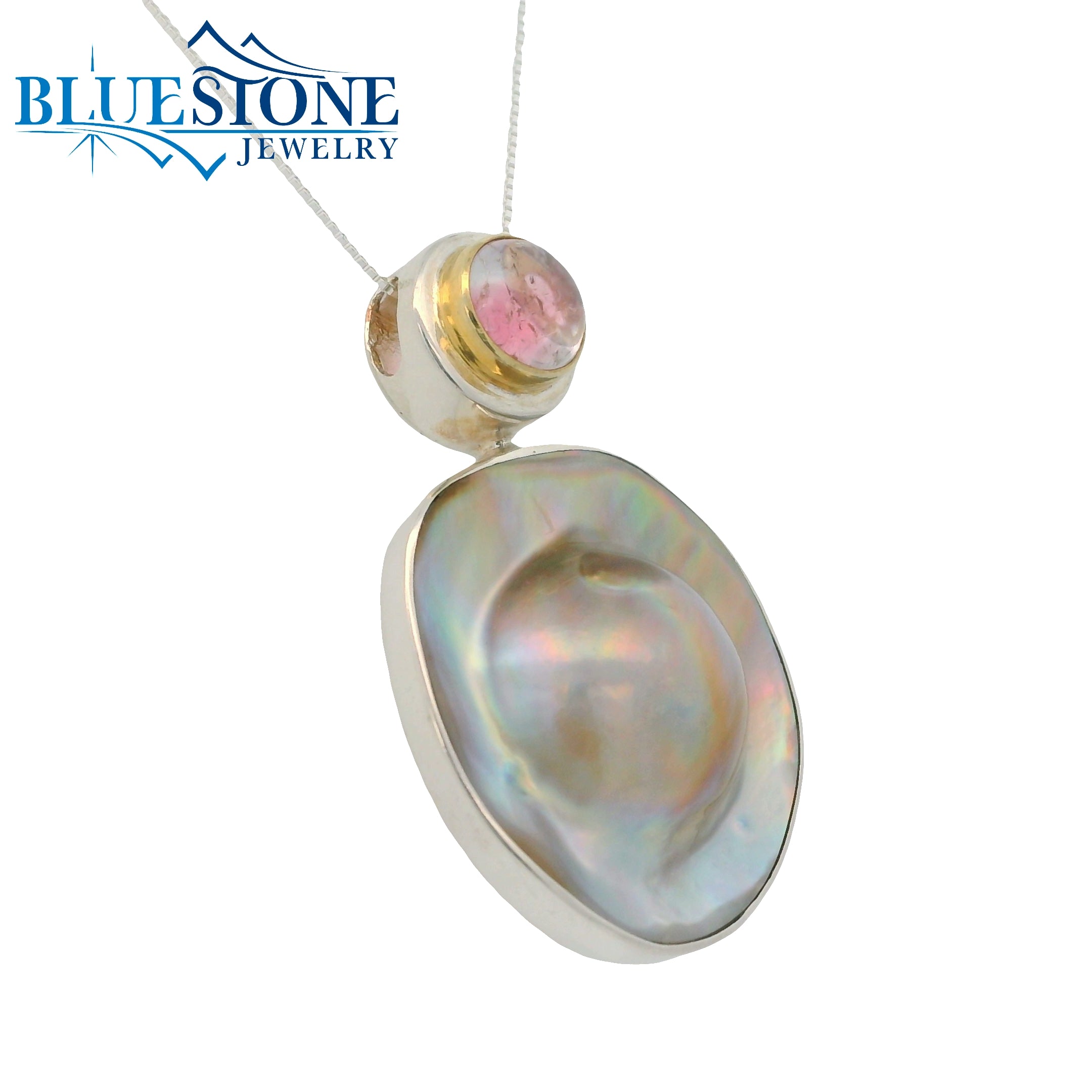 Sterling Silver and 22 Karat Yellow Gold Vermeil Pendant with One 1" x 1 1/8"" Oval Cut Natural Pearl Blister and One 7.5mm Round Cut Pink Tourmaline. Pendant Measures 1 1/8" x 1.5". Comes on an 18" Sterling Silver Box Chain. Local Lake Tahoe Artist Michou.
