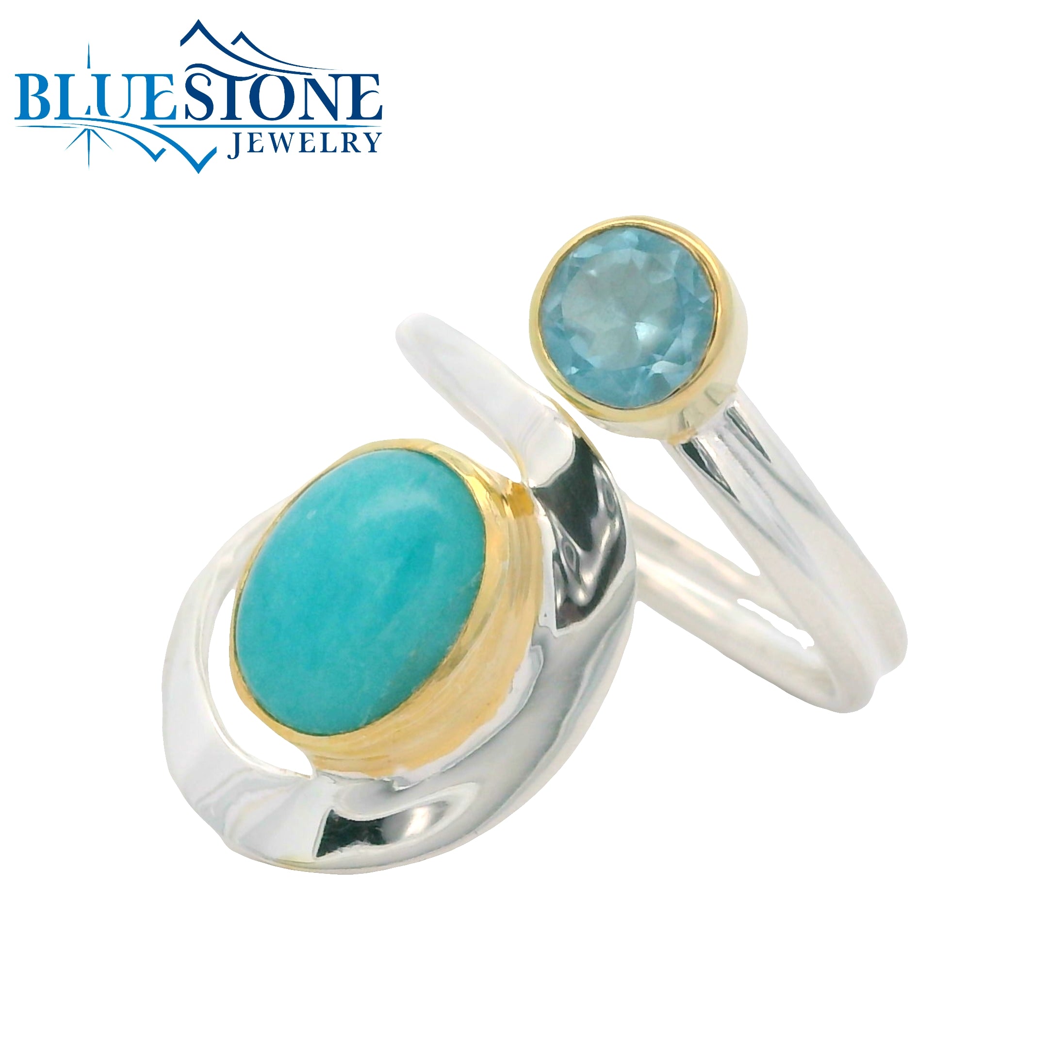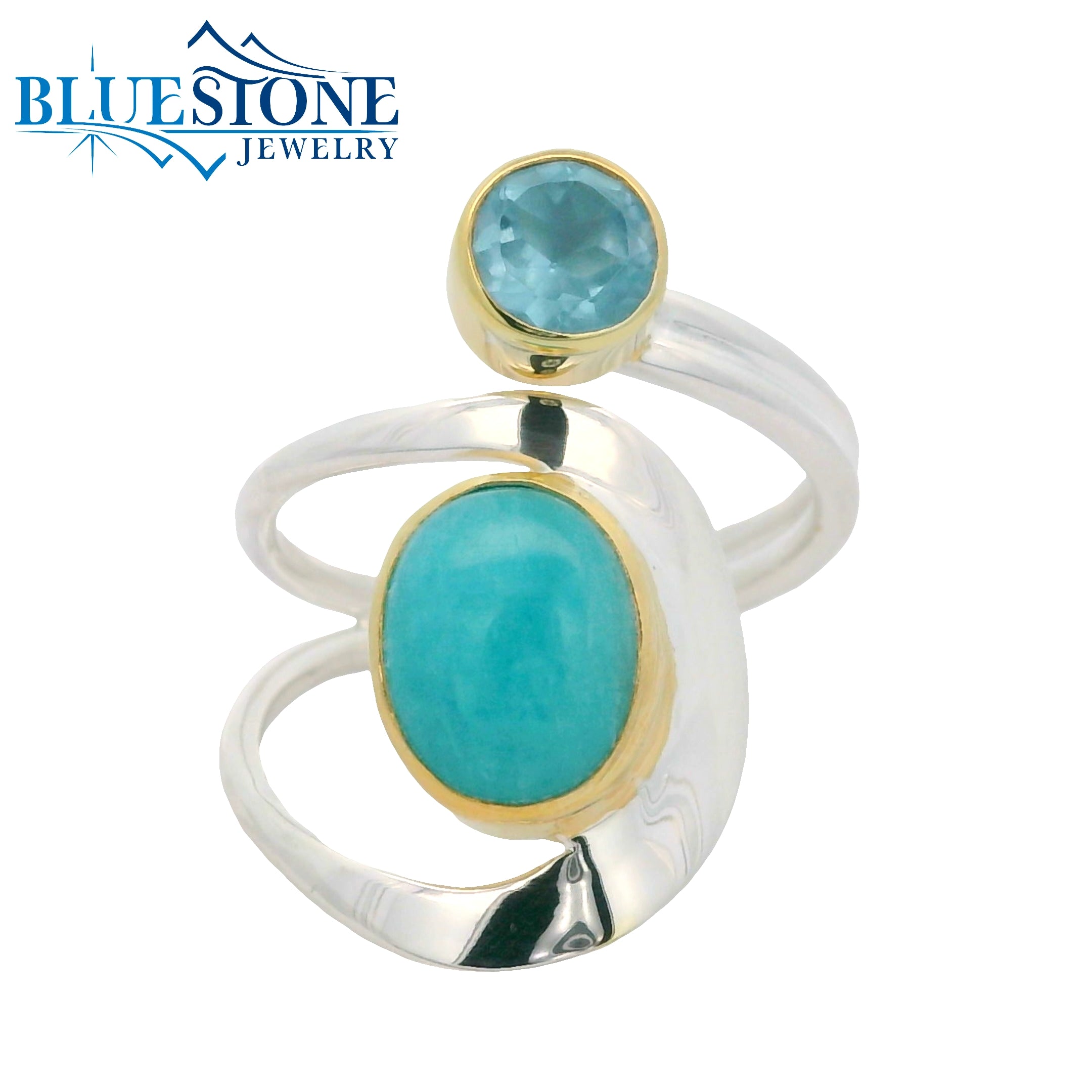 Sterling Silver with 22 Karat Yellow Gold Vermeil Ring with One 7.5mm x 9.5mm Oval Cut Amazonite and One 5mm Round Cut Baby Blue Topaz. Ring Size 6. Local Lake Tahoe Artist Michou.