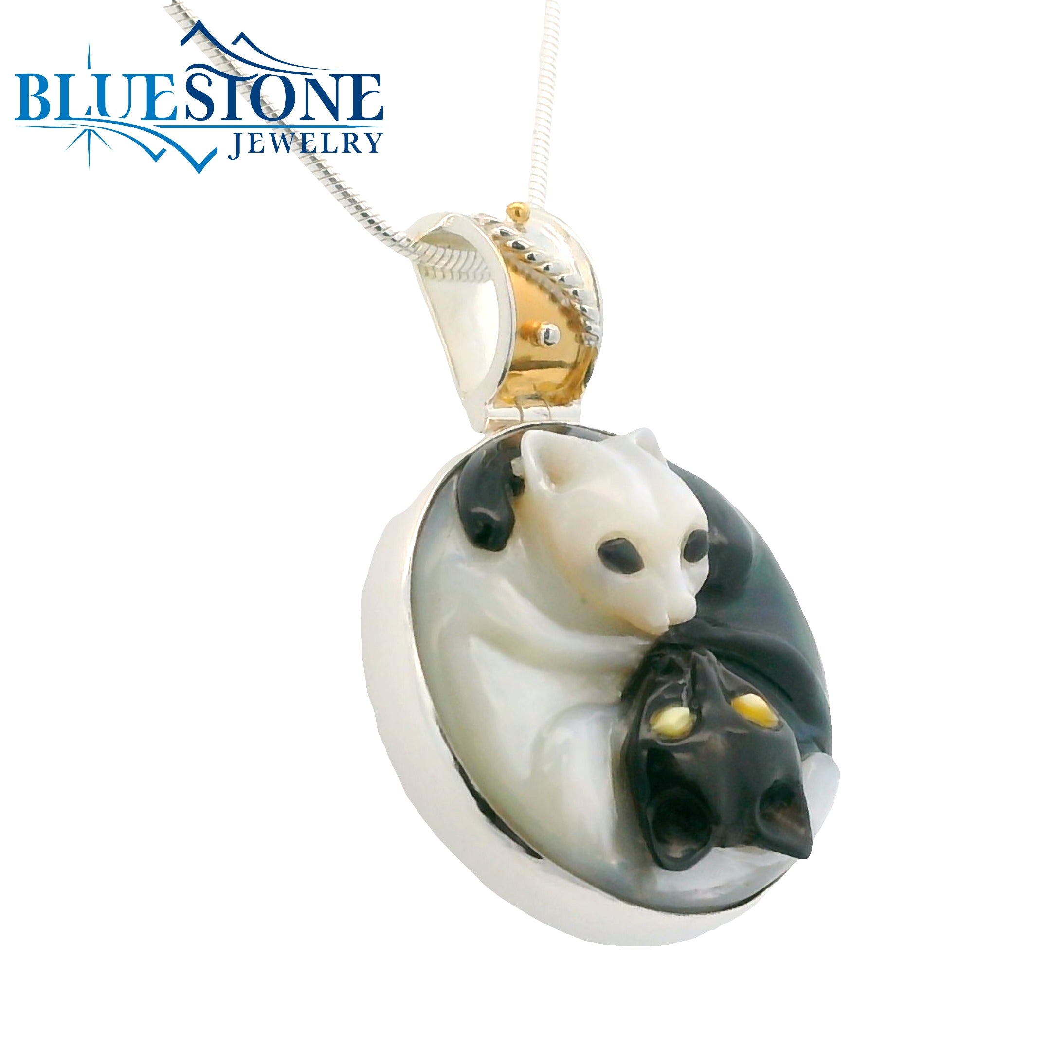 Sterling Silver and 22 Karat Yellow Gold Vermeil Yin Yang Cat Pendant with Hand Carved Black and White Mother of Pearl. Measures 1" Wide. Comes on a 20" Sterling Silver Snake Chain. Can be worn between 18" and 20". Local Lake Tahoe Artist Michou.