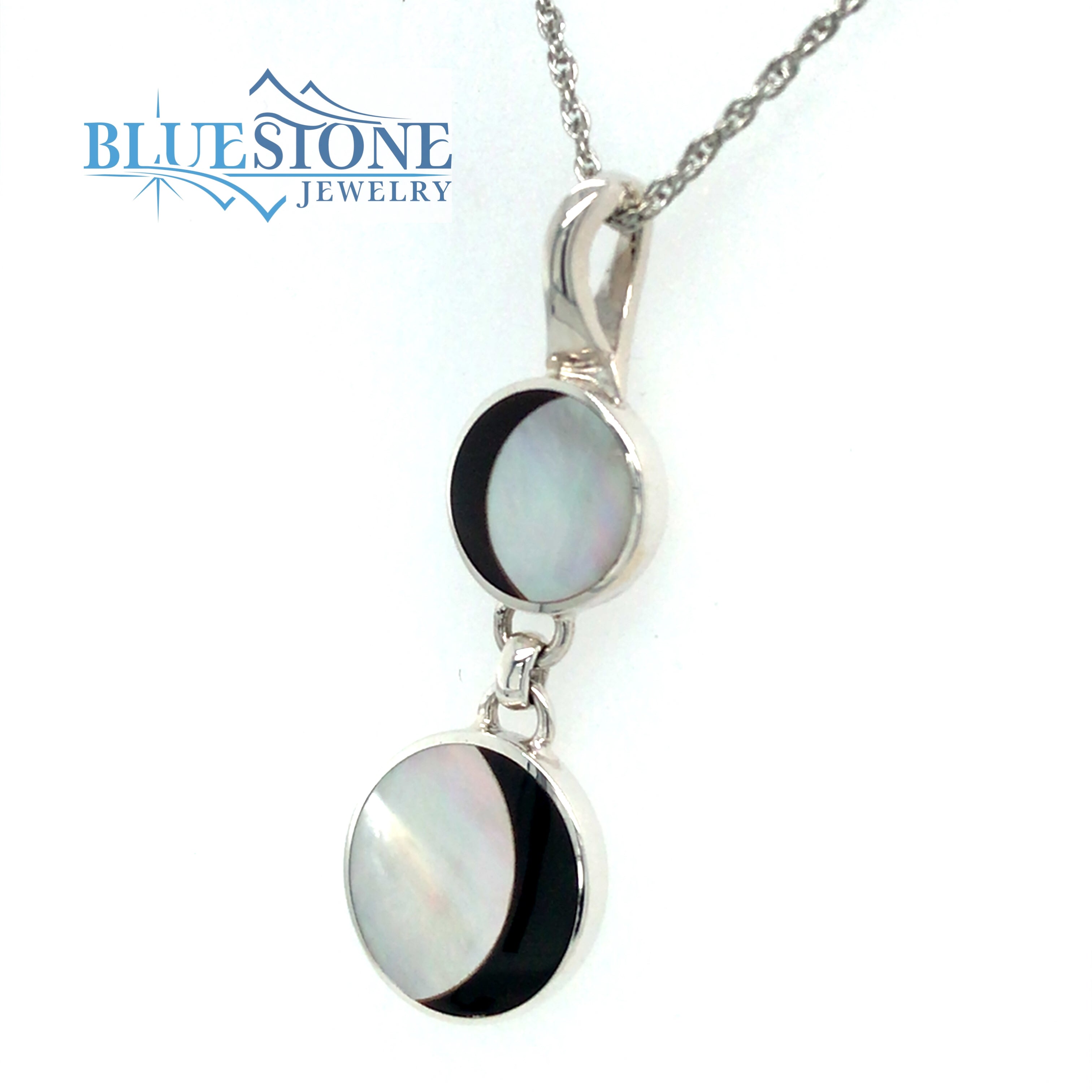 Sterling Silver Rhodium Plated Moon Pendant with Black and White Mother of Pearl Shell. Pendant Measures Approximately 1.75 Inches Long. Chain is Sold Separately. Comes on a metal alloy DISPLAY chain.