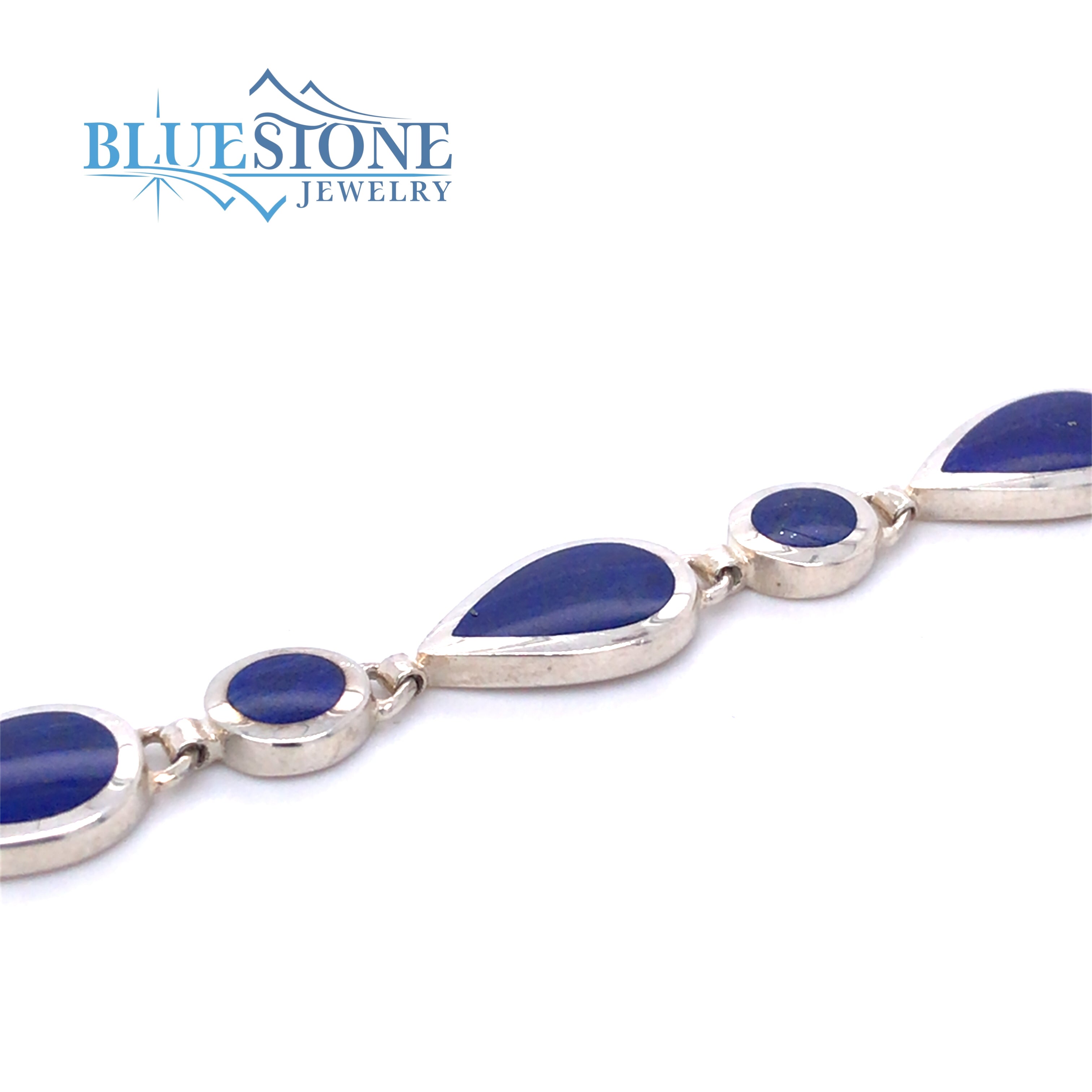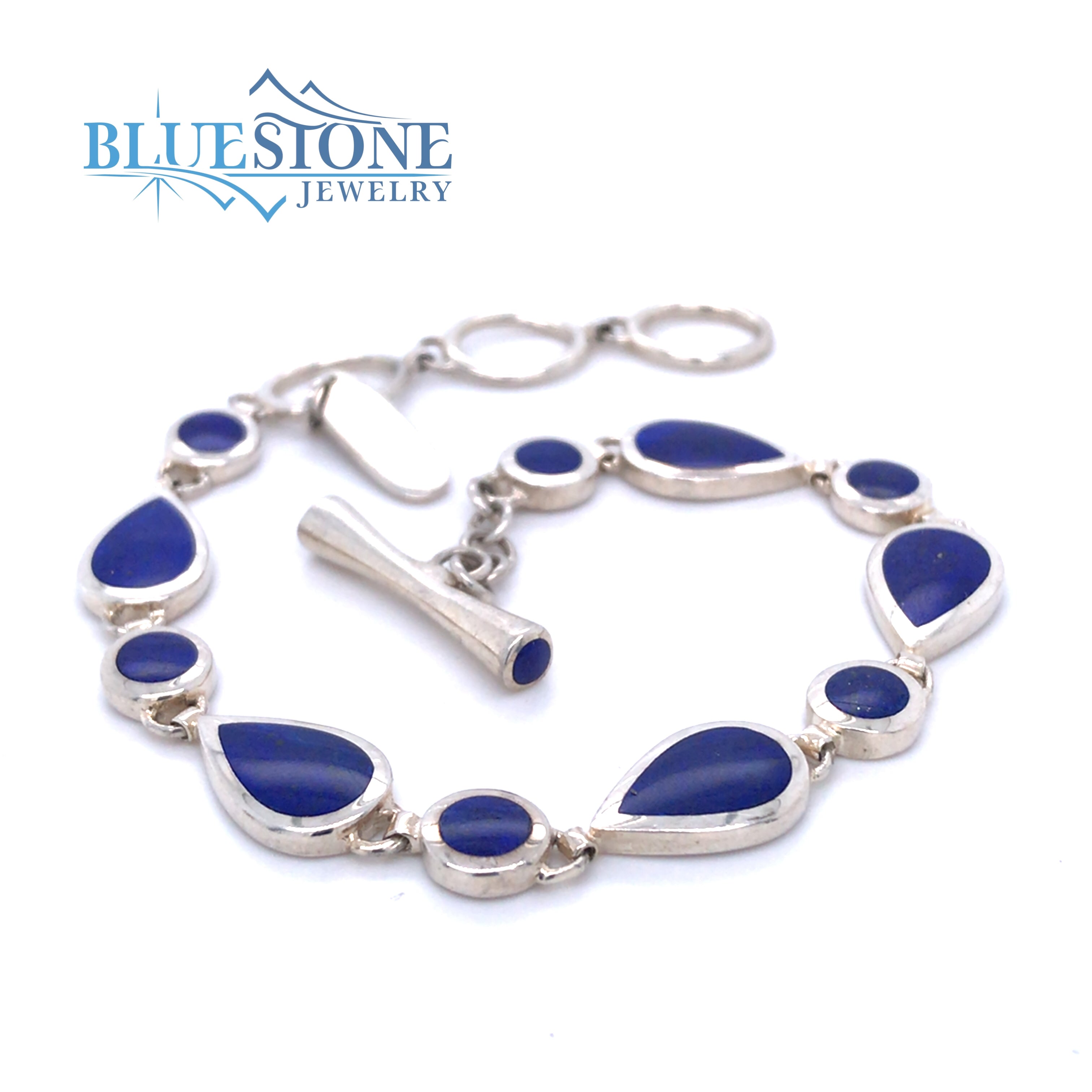 Sterling Silver with Rhodium Plating Bracelet with 11 Natural Lapis Lazuli and Two Round Lapis in Toggle Clasp. Can be worn between 6.5" and 8".