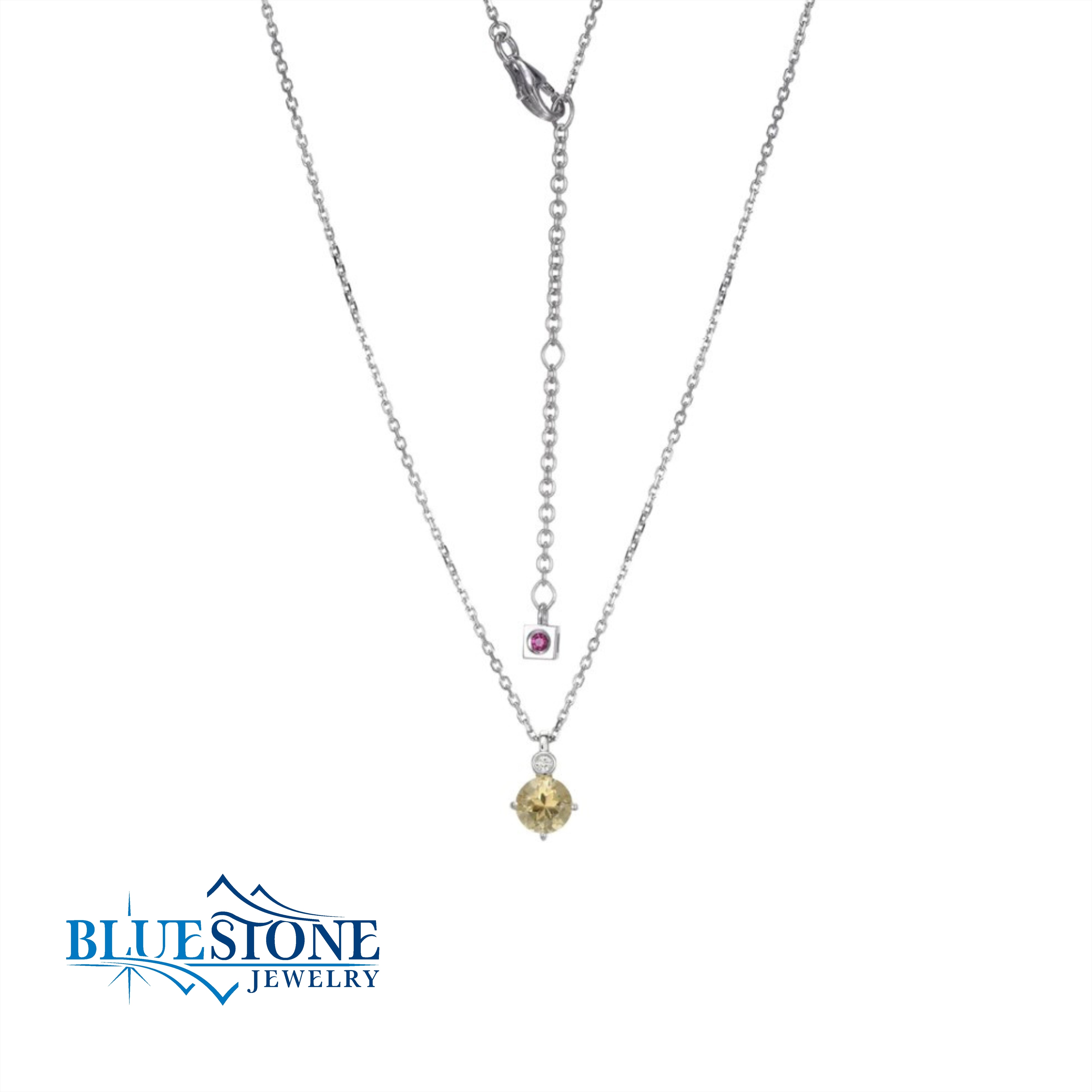 Sterling Silver Rhodium Plated November Birthstone Pendant with One 6mm Round Citrine and One Round Lab Grown Diamond at 0.02 Total Carat Weight. Features One Hidden Round Created Ruby which represents inner beauty, inner peace & innerstrength. Comes on a 19 Inch 1.9mm Faceted Crossed Diamond Cut Cable Chain. Can be worn at lengths between 17 to 19 inches.