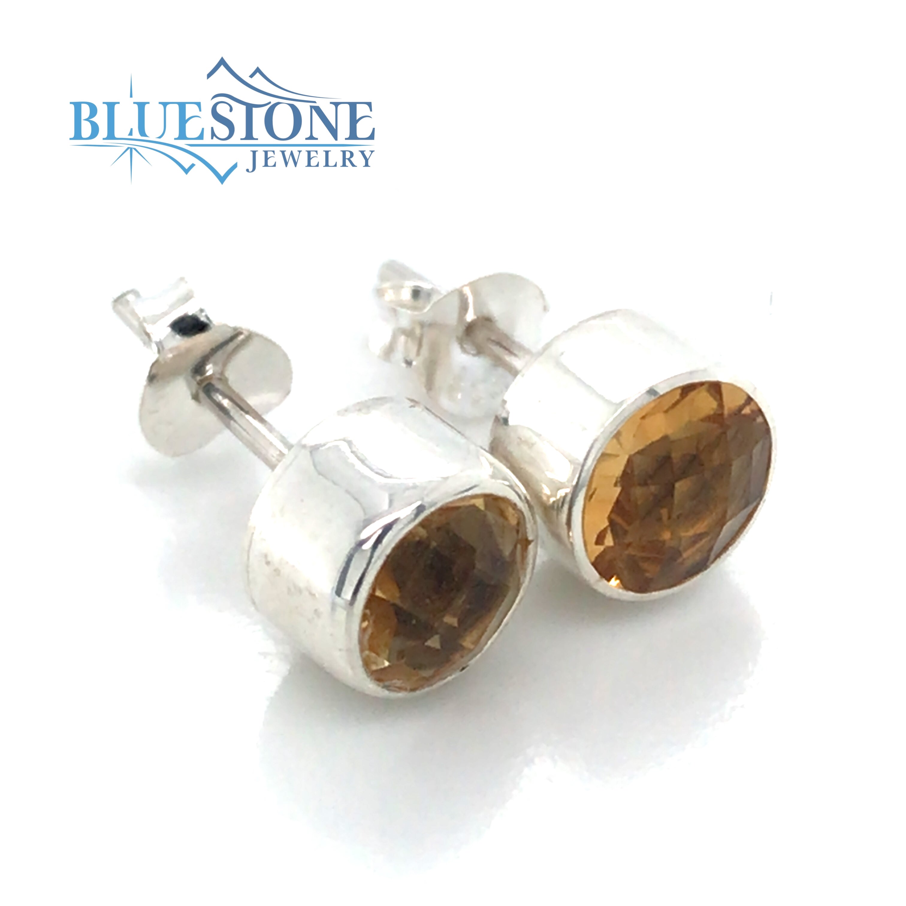 Sterling Silver Rhodium Plated Stud Earrings with Two 6mm Round Cut Citrines.