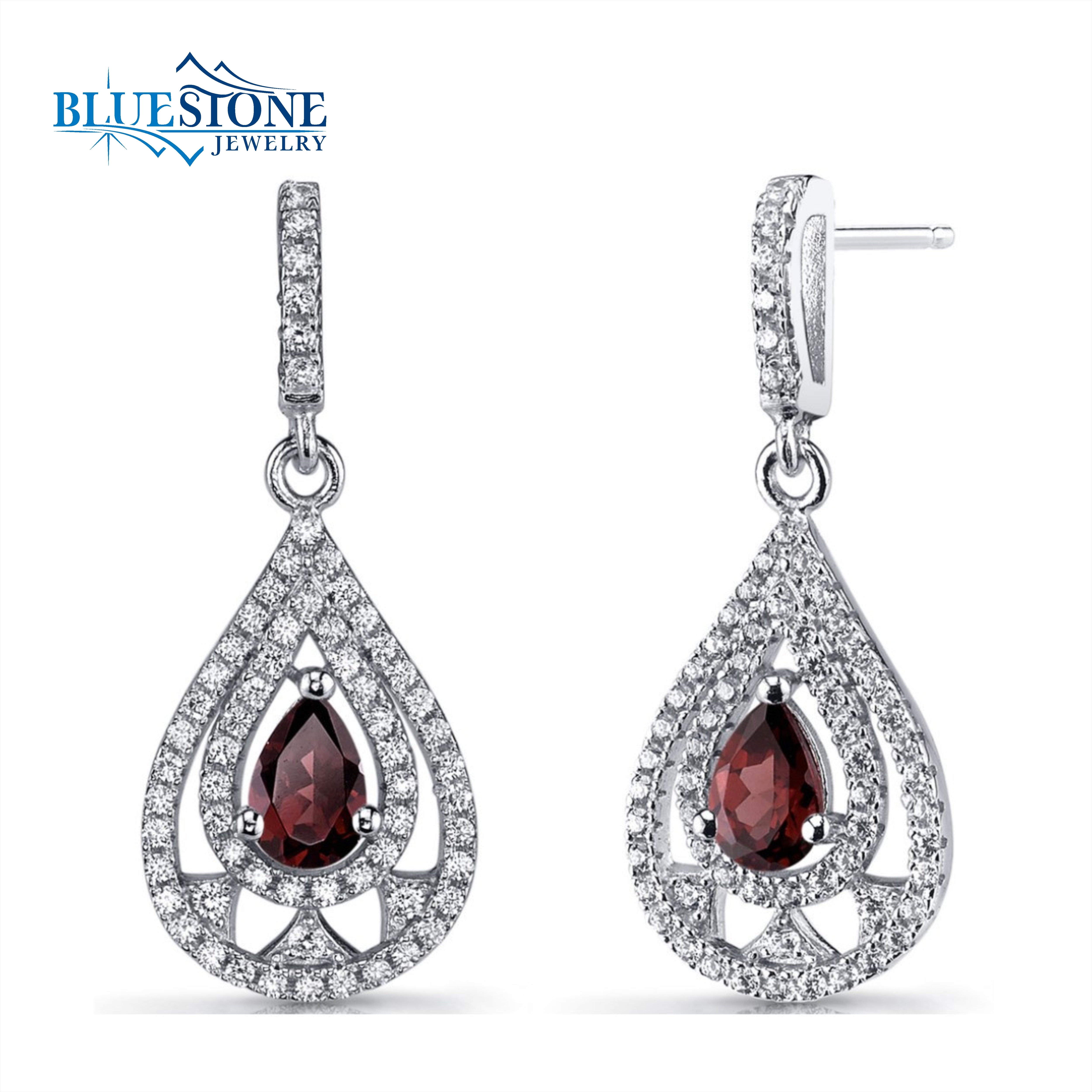 Sterling Silver Rhodium Plated Post Drop Earrings with Two 4mm x 6mm Pear Cut Natural Garnets at 1.00 Total Carat Weight and Cubic Zirconia Accents at 1.28 Total Carat Weight. Measure 1 1/8 Inches Long.