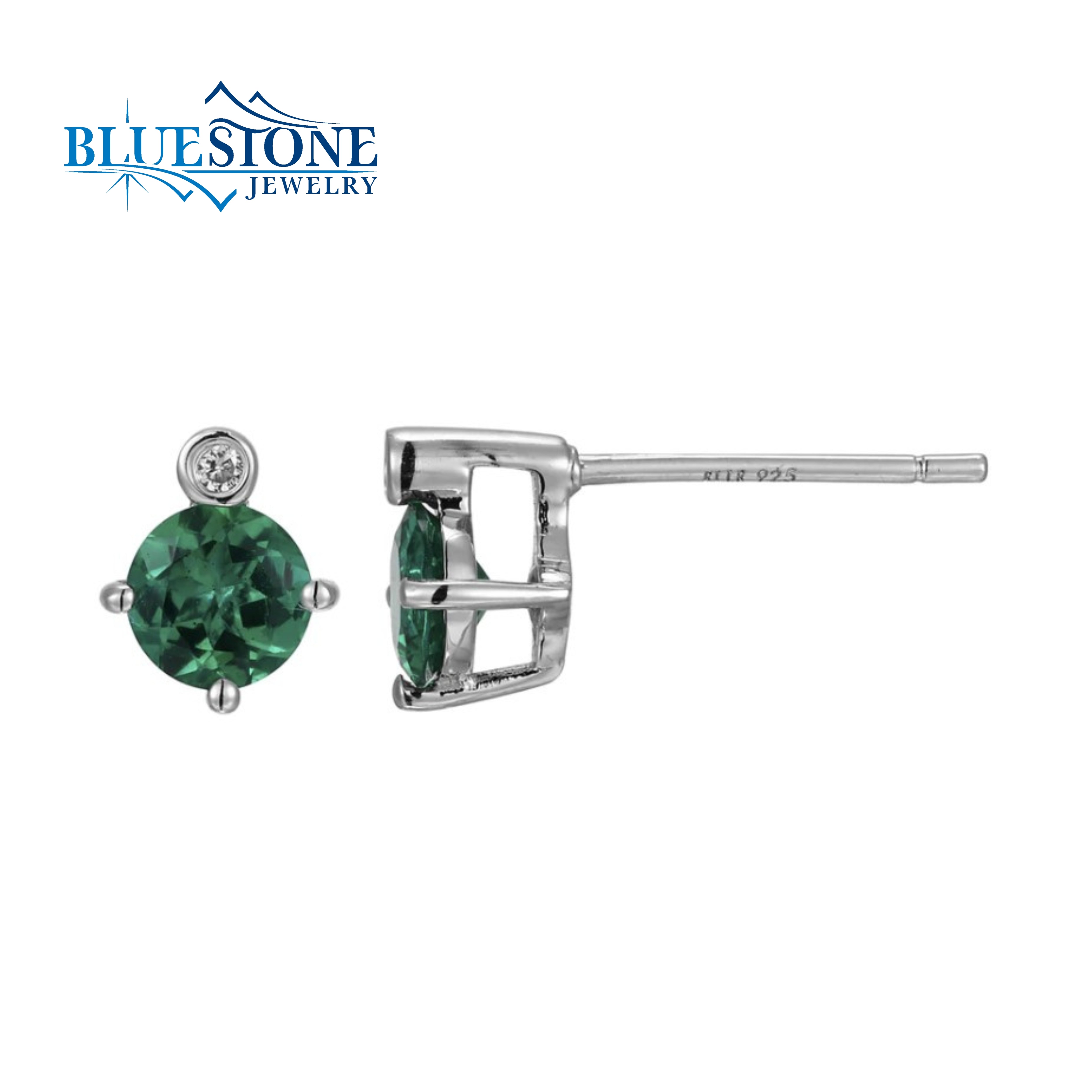 Sterling Silver Rhodium Plated May Birthstone Stud Earrings with Two 5mm Round Created Emeralds and Two 0.8mm Round Lab Grown Diamonds at 0.02 Total Carat Weight F/C H-I/I1 Quality. Also Feature Two Hidden Round Created Rubies which represent inner beauty, inner peace & inner strength.