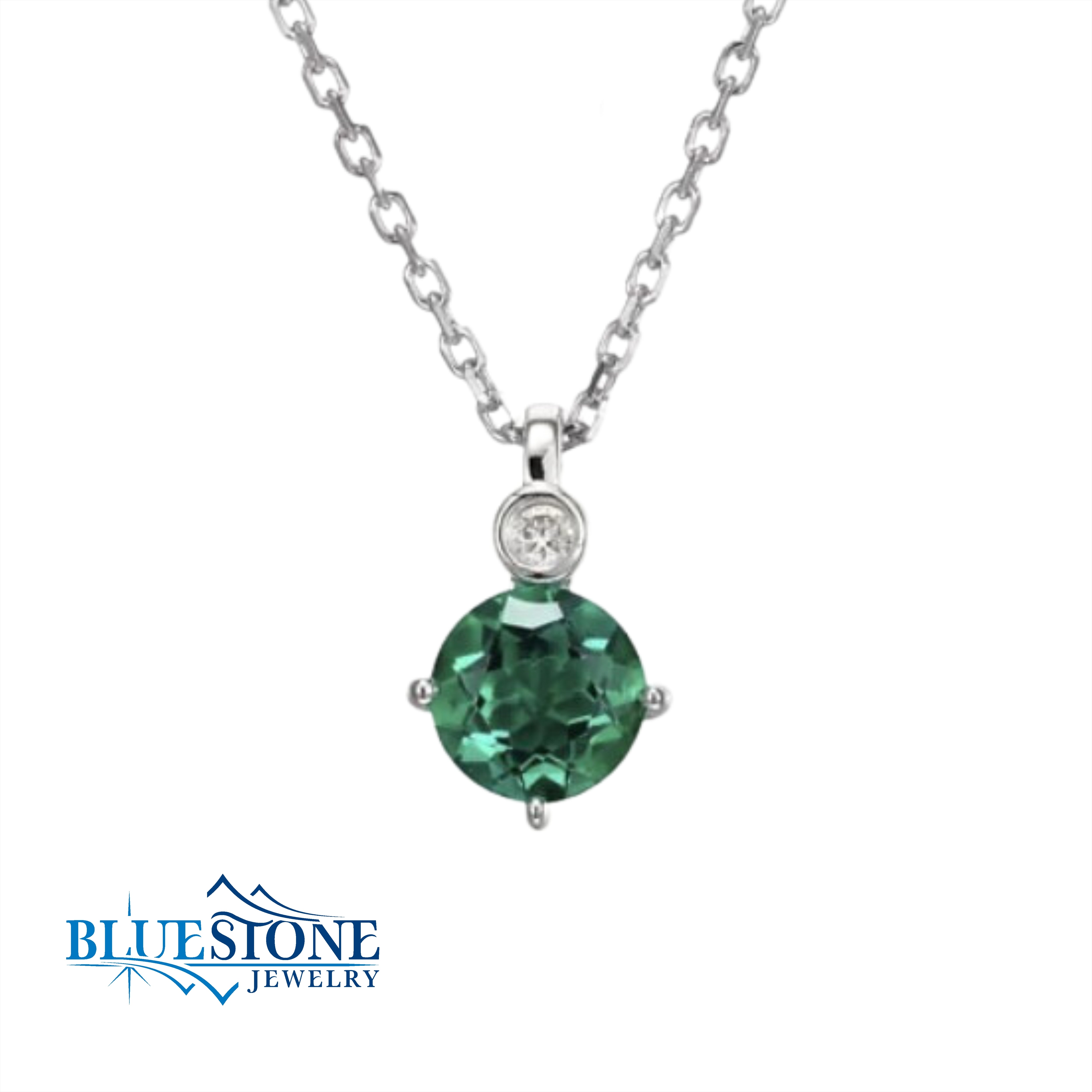 Sterling Silver Rhodium Plated May Birthstone Pendant with One 6mm Round Created Emerald and One Round Lab Grown Diamond at 0.02 Total Carat Weight. Features One Hidden Round Created Ruby which represents inner beauty, inner peace & inner strength. Comes on a 19 Inch 1.9mm Faceted Crossed Diamond Cut Cable Chain. Can be worn at lengths between 17 to 19 inches.