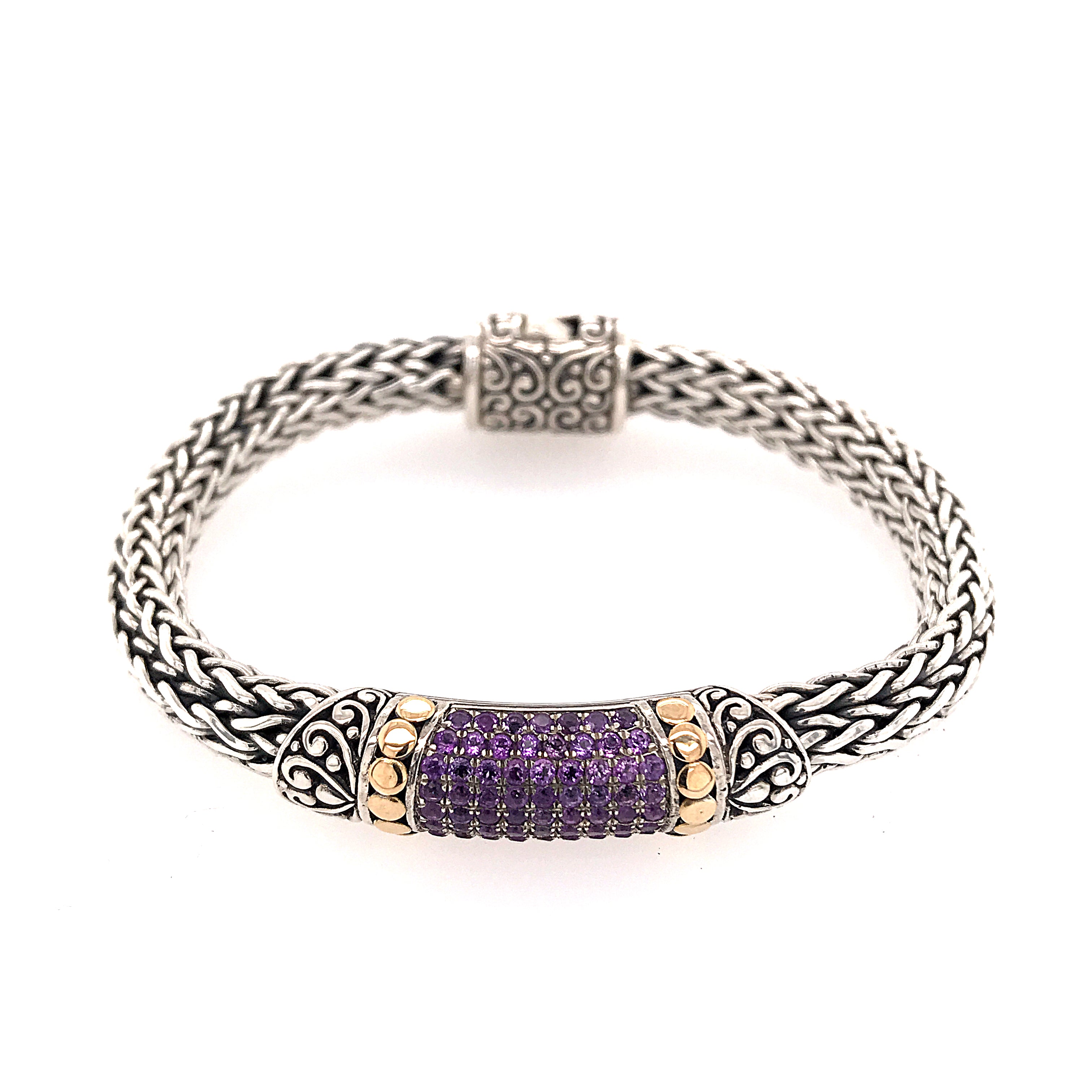 Handwoven Sterling Silver & 18 Karat Yellow Gold Snake Bracelet with Pave Amethyst, Measures 6.5 Inches in Length. 45 PtsLocal Lake Tahoe Designer.Other sizes are available. Please inquire.