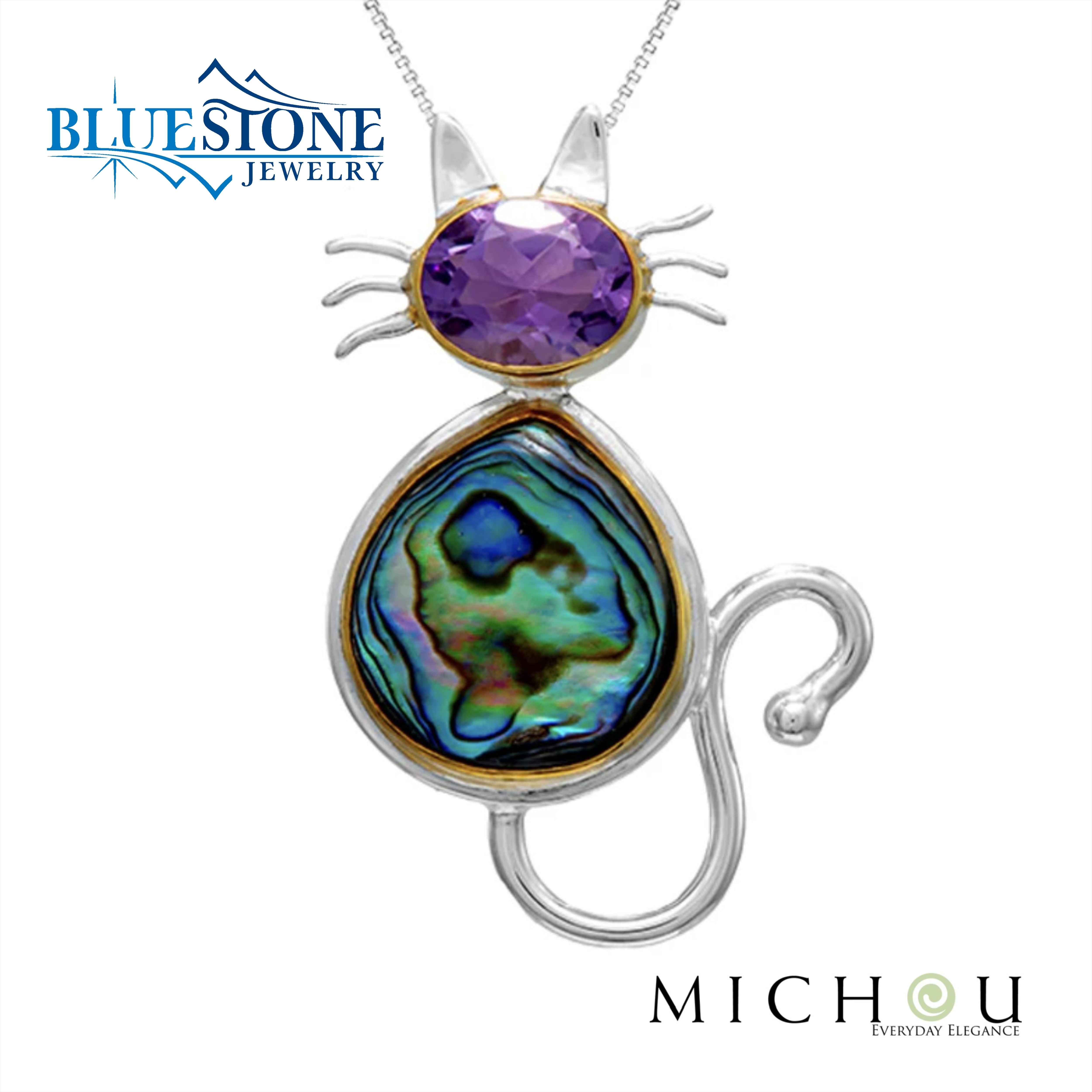 Sterling Silver and 22 Karat Yellow Gold Vermeil Cat Pendant with African Amethyst and Paua Shell. Comes on an 18" Sterling Silver Box Chain. Local Lake Tahoe Artist Michou.