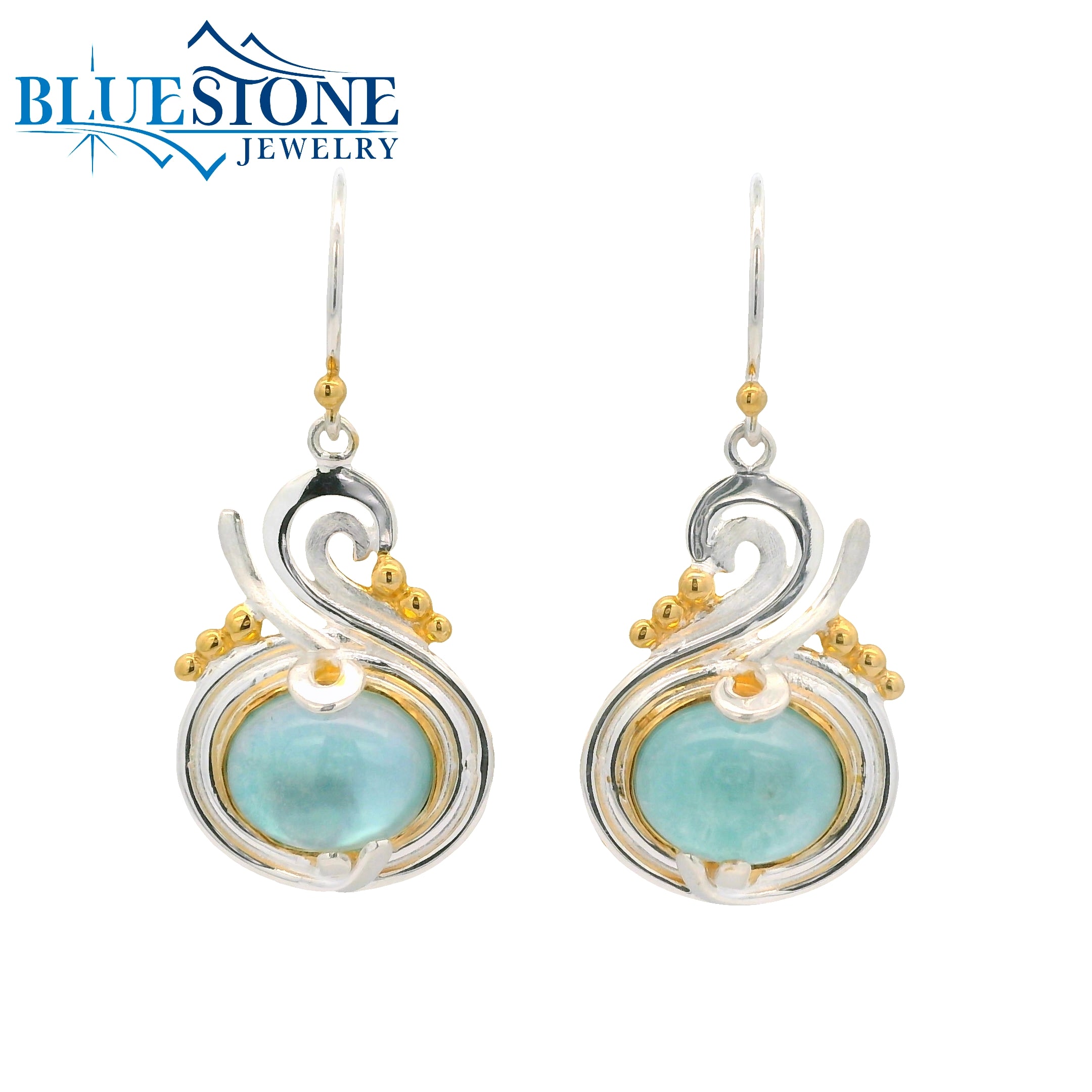 Sterling Silver and 22 Karat Yellow Gold Vermeil Earrings with Two Oval Cut Amazonite Gemstones with a Cabochon White Crystal Over Top. Earrings Measure Approximately 1.35 Inch Long. By Local Lake Tahoe Designer Michou!