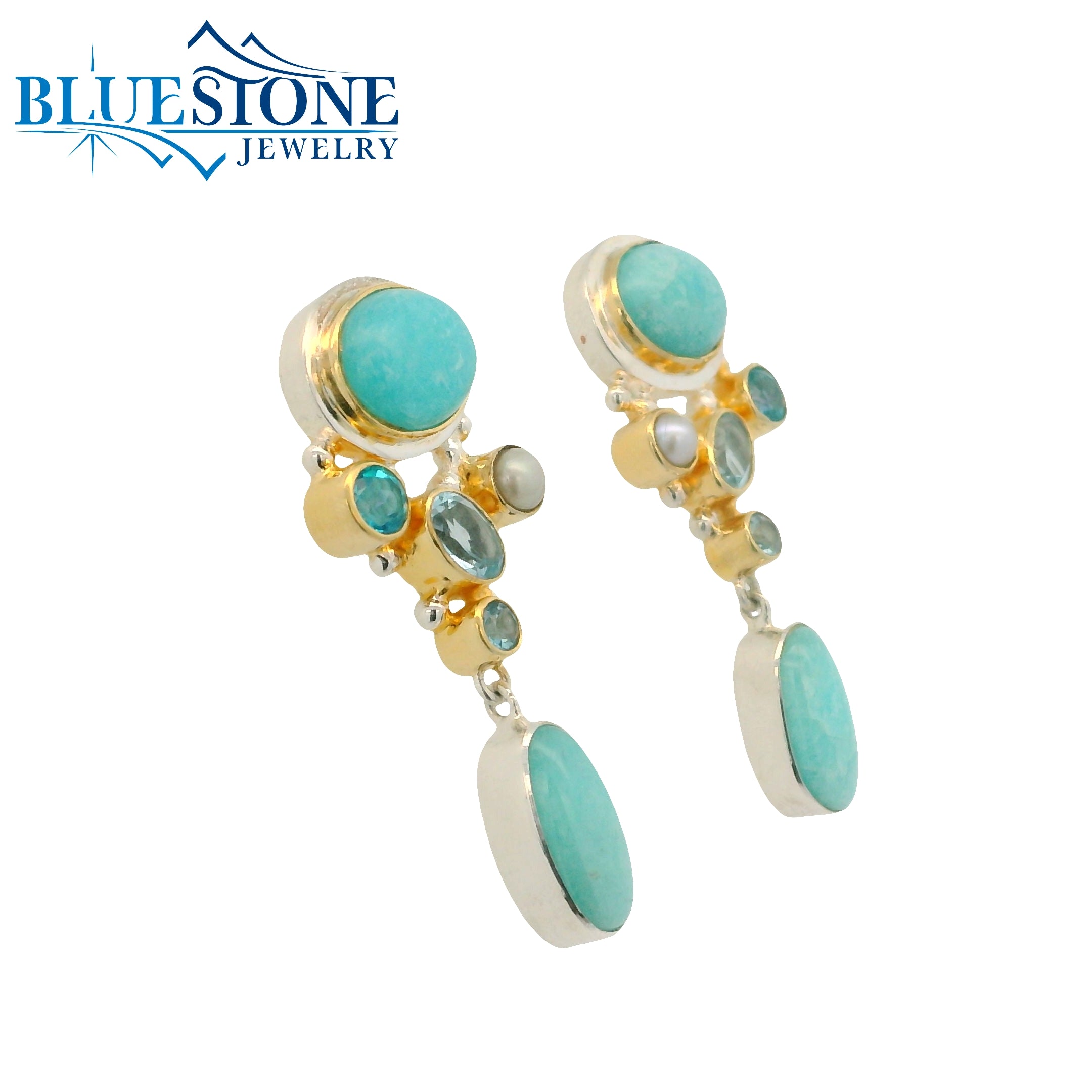 Sterling Silver and 22 Karat Yellow Gold Vermeil Earrings with Amazonite, White Freshwater Pearl, Paraiba Topaz, Sky Blue Topaz and Baby Blue Topaz.By local Lake Tahoe designer Michou!