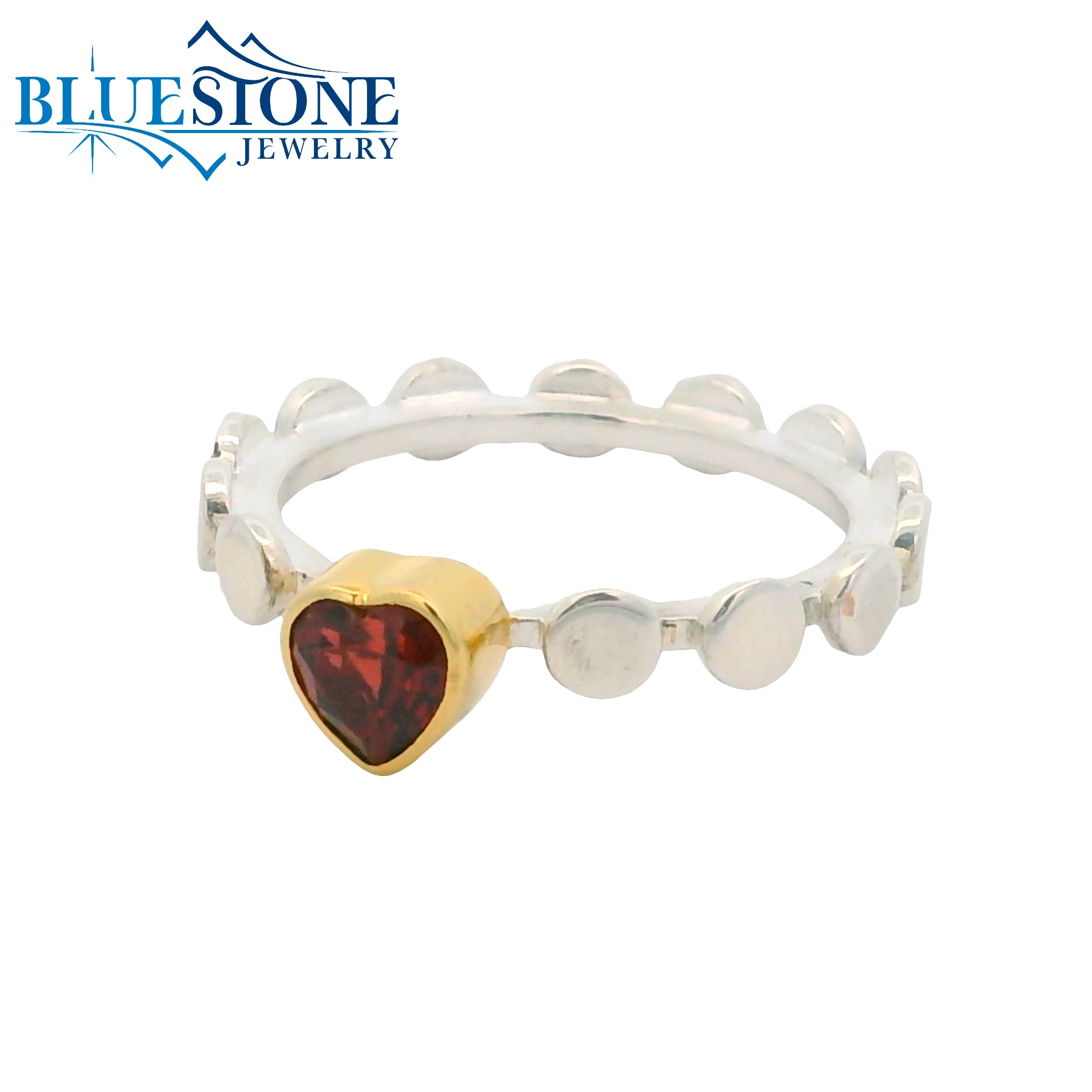 Sterling Silver and 22 Karat Yellow Gold One-of-a-Kind Ring with One Heart Cut Garnet. Ring Size 7.Local Lake Tahoe Artist Michou.