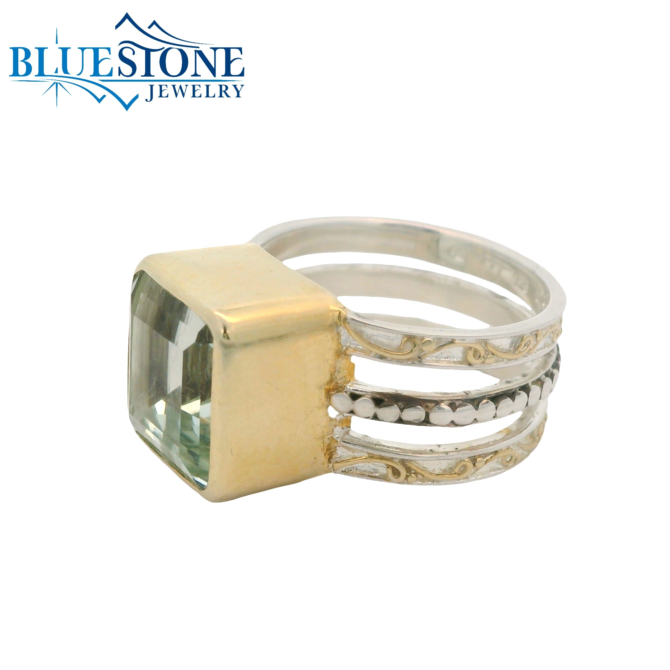 Sterling Silver and 22 Karat Yellow Gold One-of-a-Kind Ring with One 11mm Square Cut Green Amethyst. Ring Size 7.Local Lake Tahoe Artist Michou.