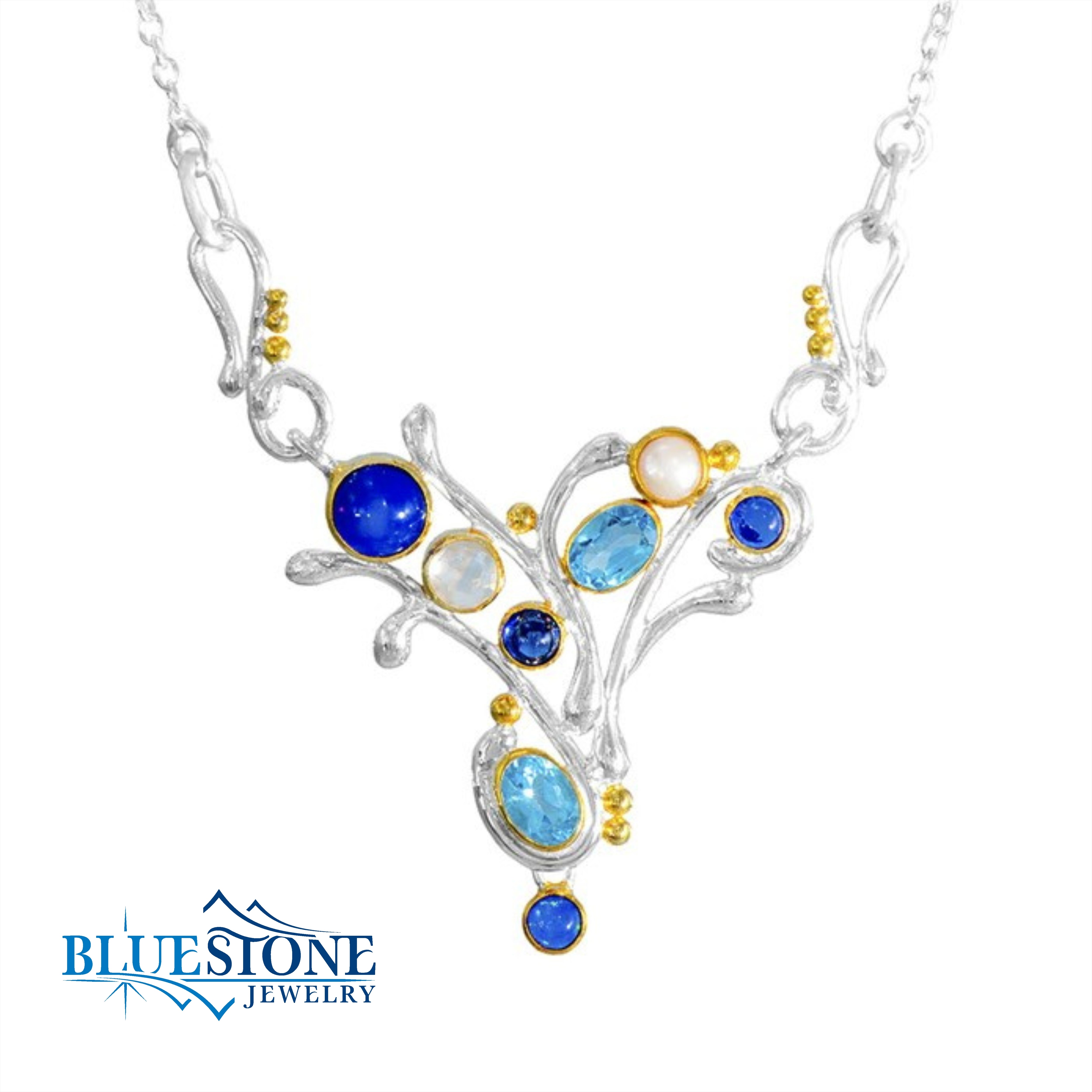 Sterling Silver and 22 Karat Yellow Gold Vermeil Necklace with Two Baby Blue Topazes, One Blue Kyanite, Three Ethiopian Opals, One Mother of Pearl/Checkerboard cut Crystal Quartz Doublet and One White Freshwater Pearl. Measures 20 Inches Long.By local Lake Tahoe designer Michou!