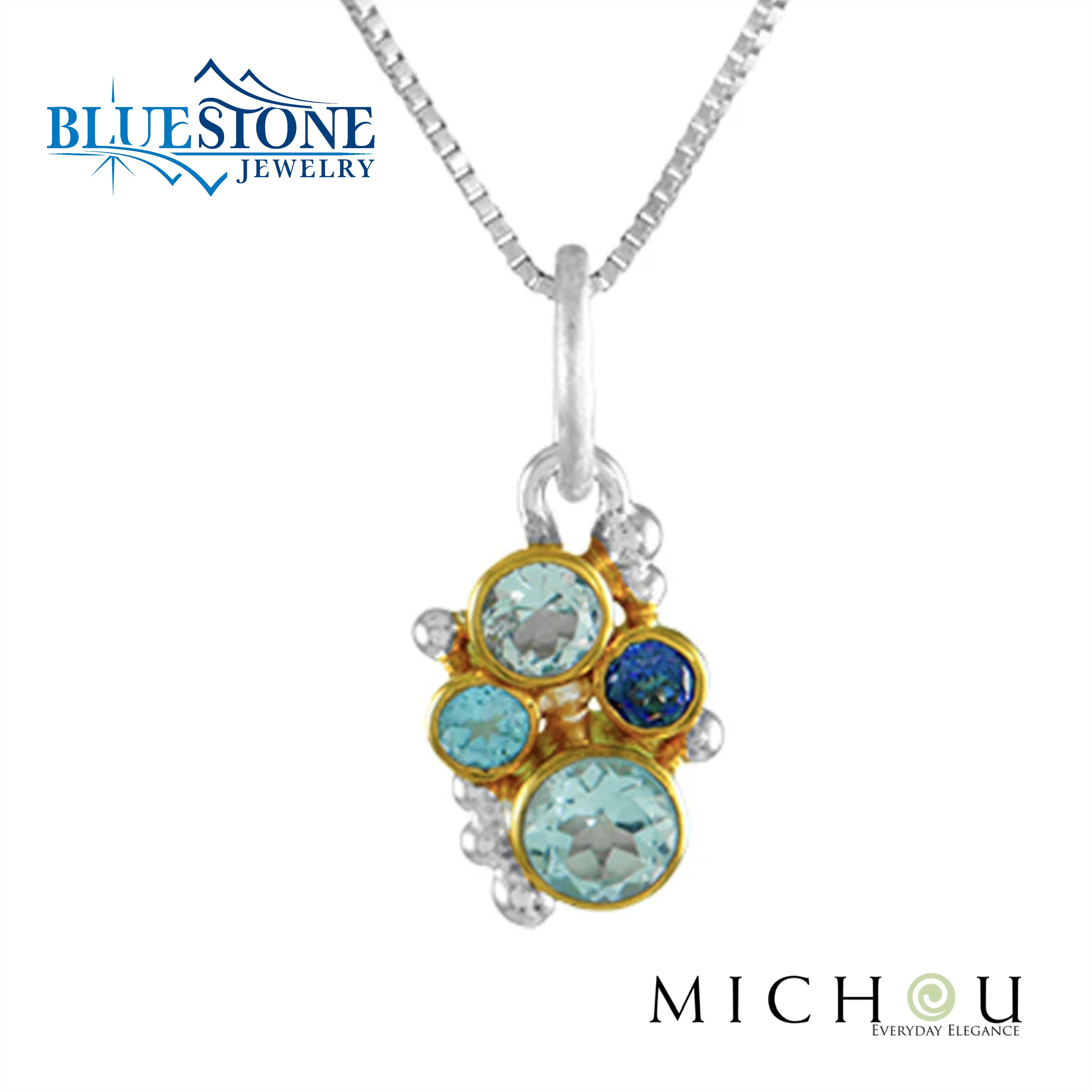 Sterling Silver and 22 Karat Yellow Gold Vermeil Necklace with Two Sky Blue Topazes, One Baby Blue Topaz and One Trendy Solo Topaz. Pendant Measures 3/4 Inch Long. Comes on an 18 Inch Sterling Silver Chain.By local Lake Tahoe designer Michou!